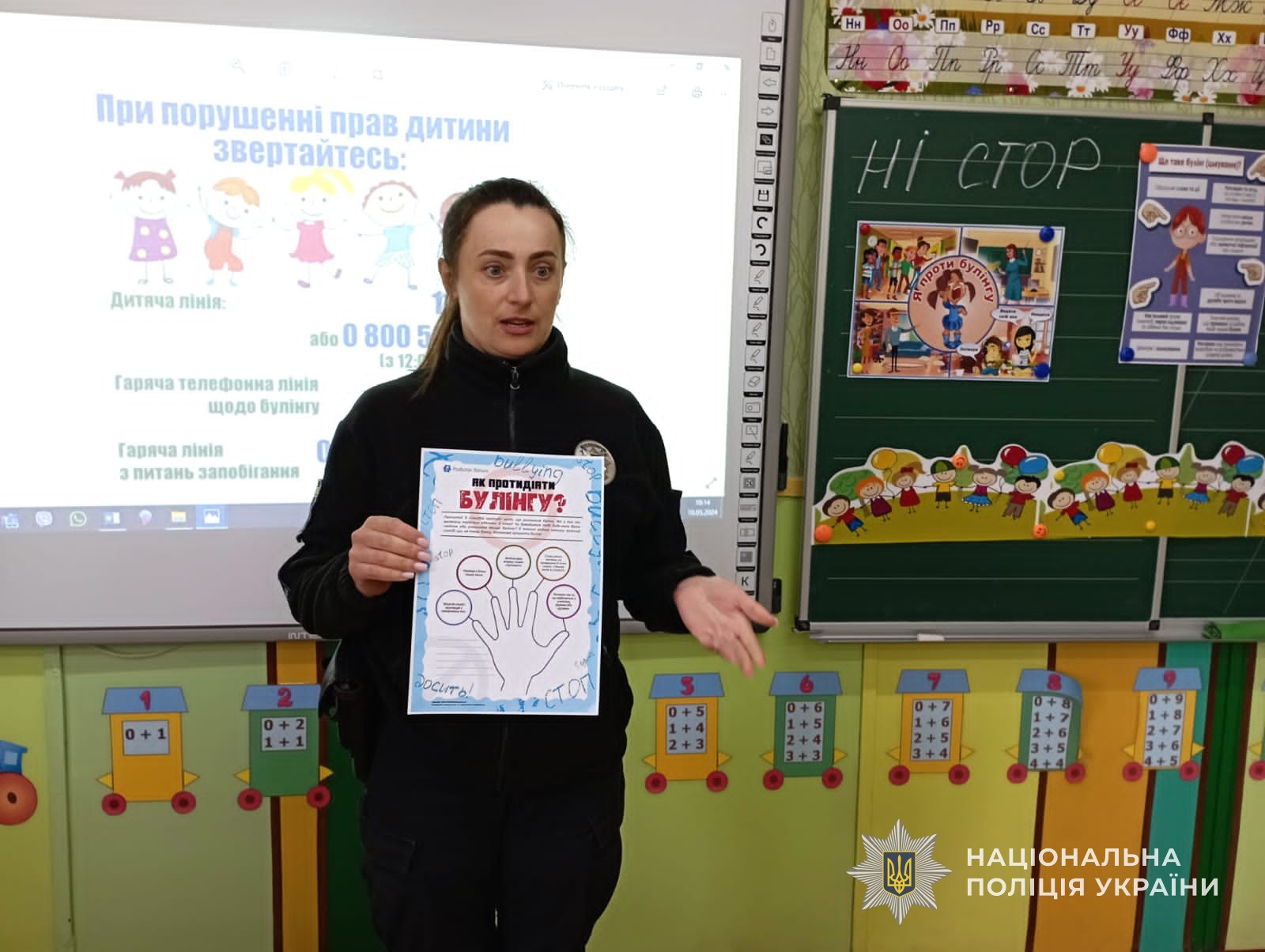 На початку зустрічі поліцейська розповіла учням про види та поняття булінгу. Інспектор наголосила дітям, що булінг - це злочин, за вчинення якого передбачена відповідальність і у випадках його прояву потрібно обов‘язково звертатися до поліції, аби припинити такі дії.