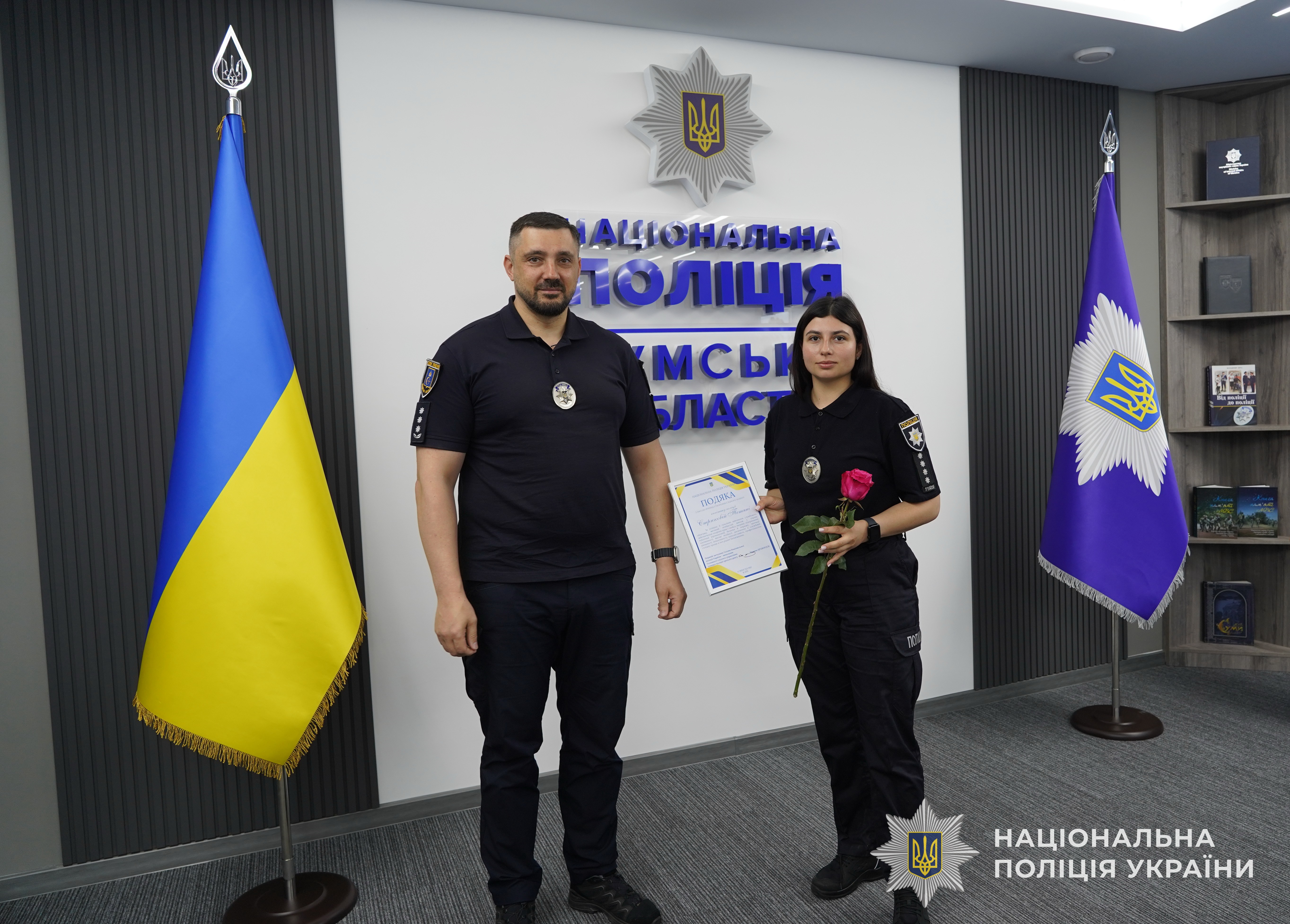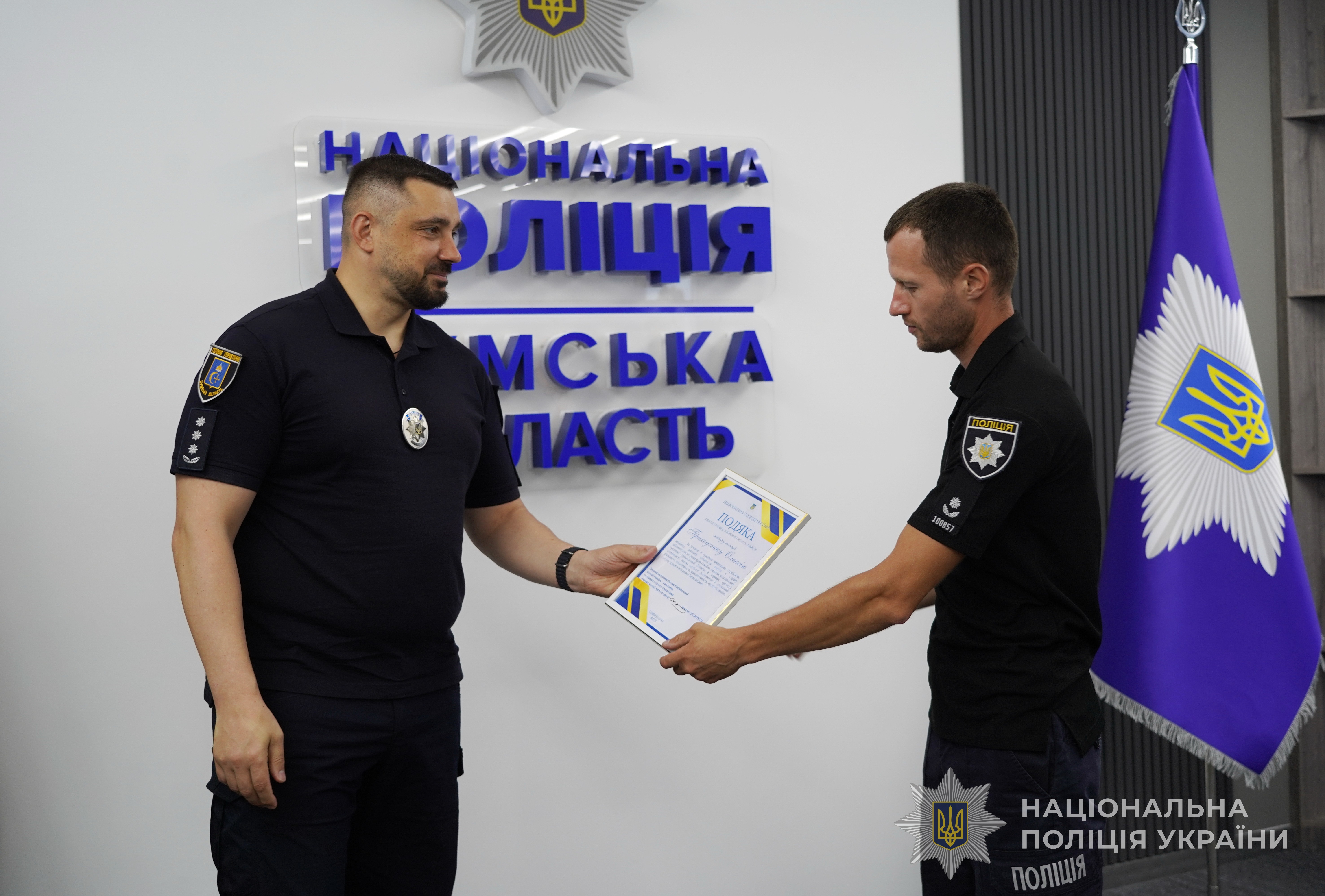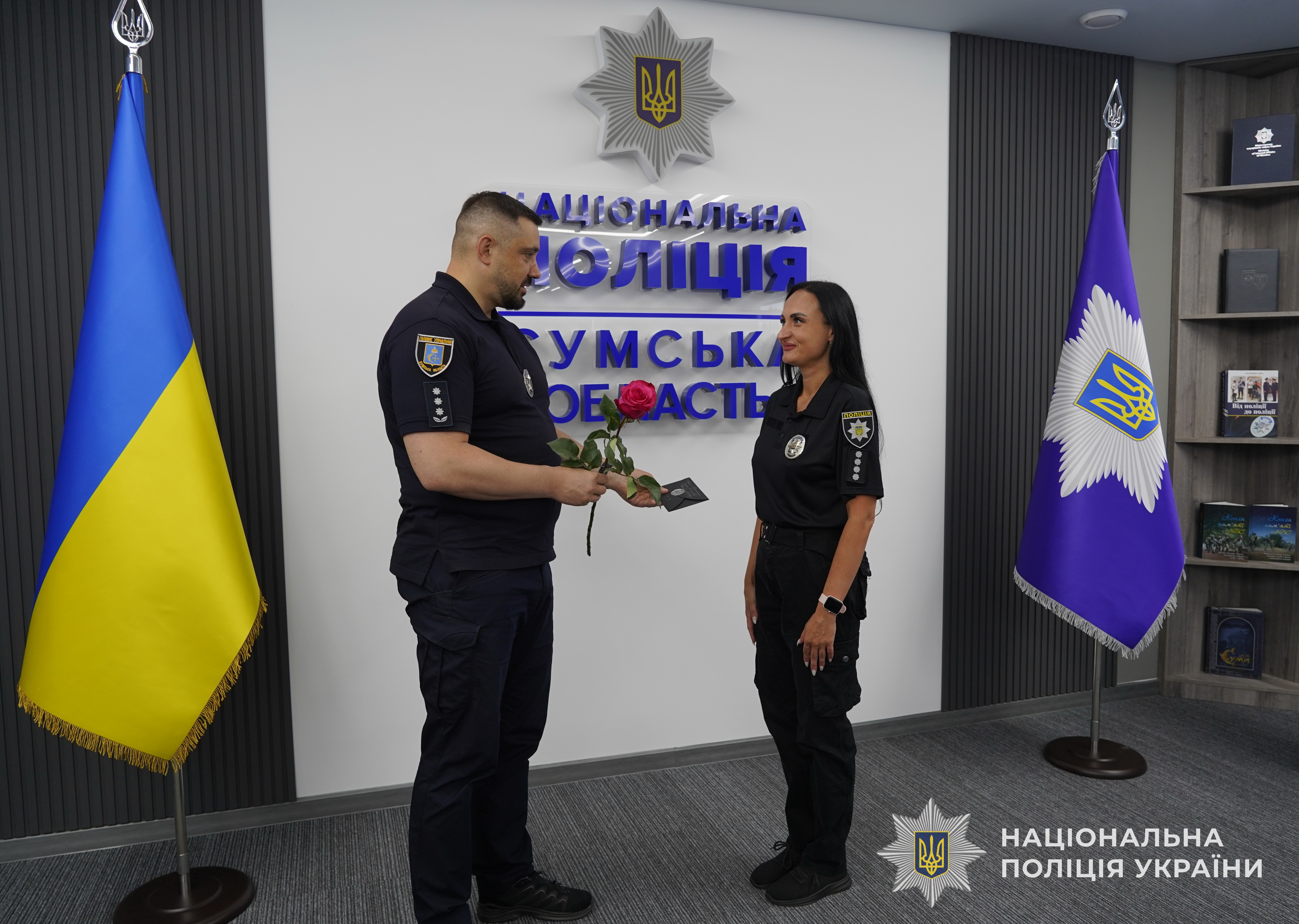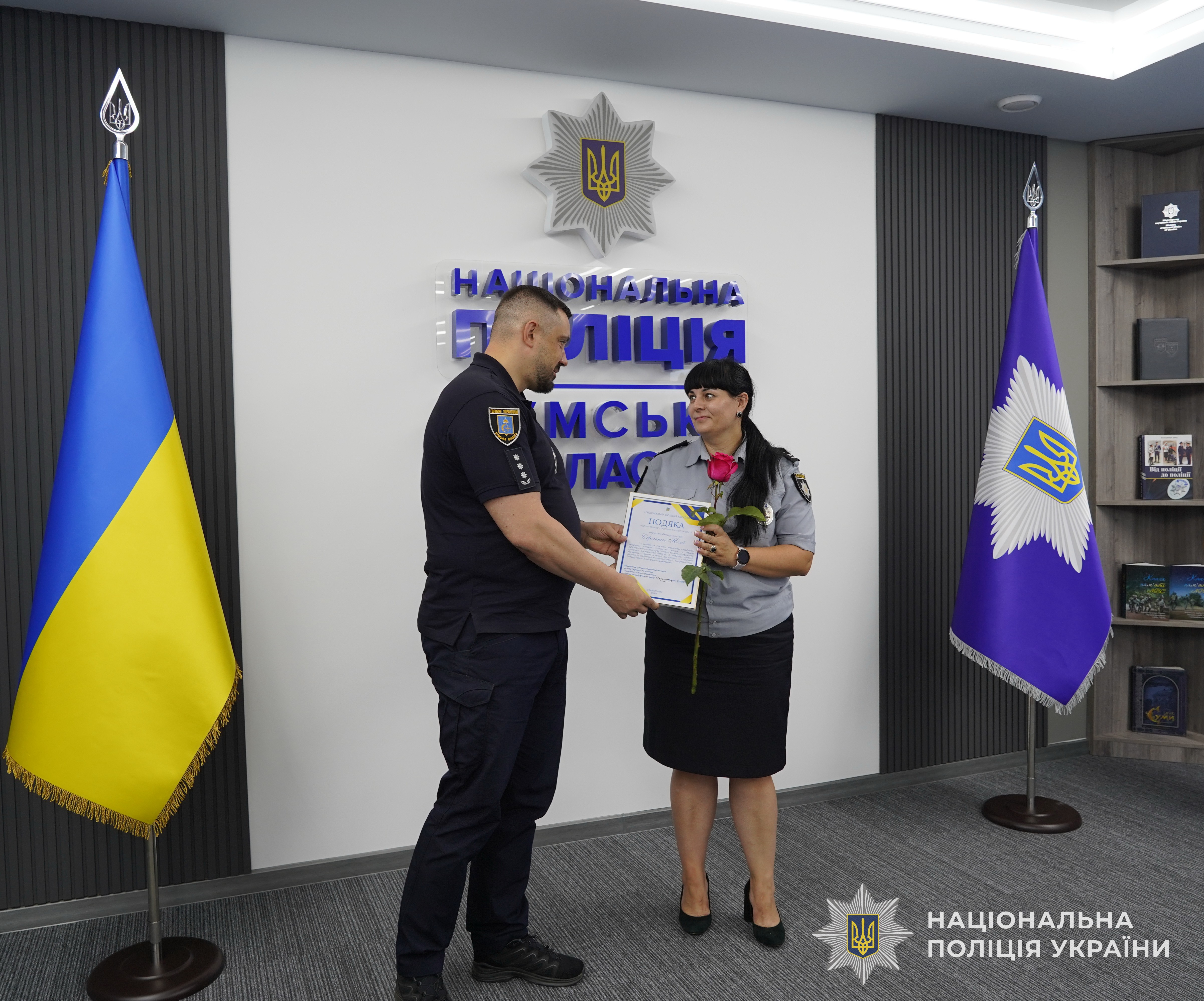За успішне й сумлінне виконання службового обов’язку, відданість Присязі, високий професіоналізм, вагомий особистий внесок у справу забезпечення охорони прав та свобод людини, протидії злочинності, підтримання публічної безпеки і порядку, високі особисті досягнення в службовій діяльності та професійні здобутки, забезпечення ефективного виконання завдань і функцій поліції очільник поліції Сумщини вручив кращим працівникам подяки, цінні подарунки Національної поліції та чергові спеціальні звання.