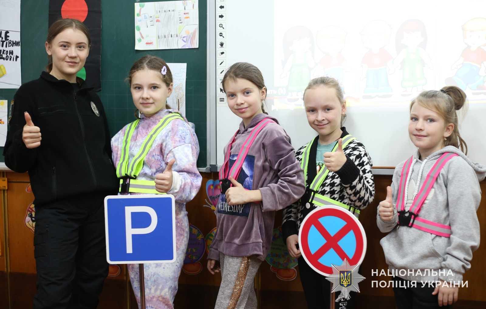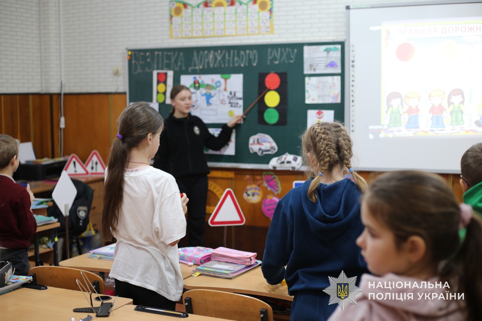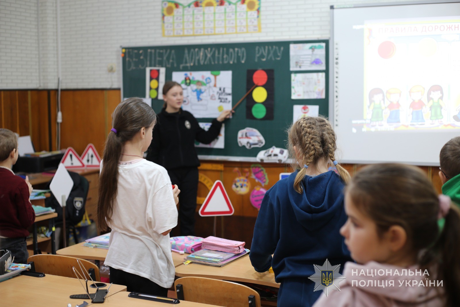 Також, інспекторка продемонструвала жилети, за допомогою яких можна себе позначити, аби стати помітними в темряві для водіїв. Далі всі бажаючи мали змогу їх приміряти. Окрім того, у формі діалогу співробітник поліції обговорила з хлопчиками та дівчатками, де та як правильно переходити дорогу та у формі гри перевірила дітей, як вони знають правила дорожнього руху. В результаті всі учні показали відмінні знання.