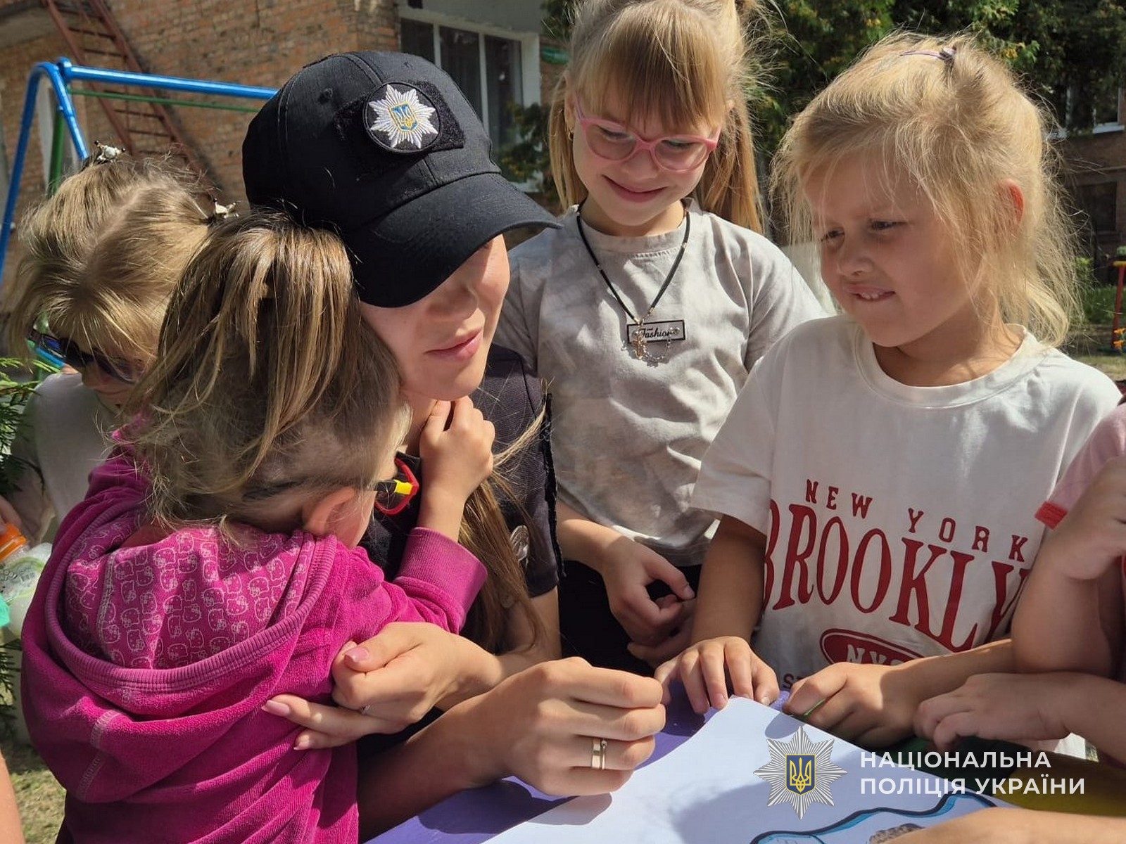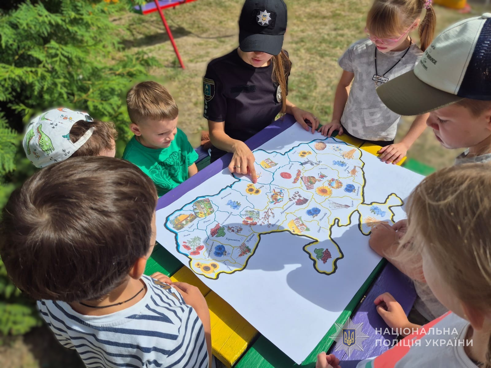 Щоб краще закріпити нові знання, правоохоронці організували творче заняття: діти заповнювали карту України яскравими картинками із зображеннями народних символів. Поліцейські розповідали, чим славиться кожна область та пояснювали значення національних символів.