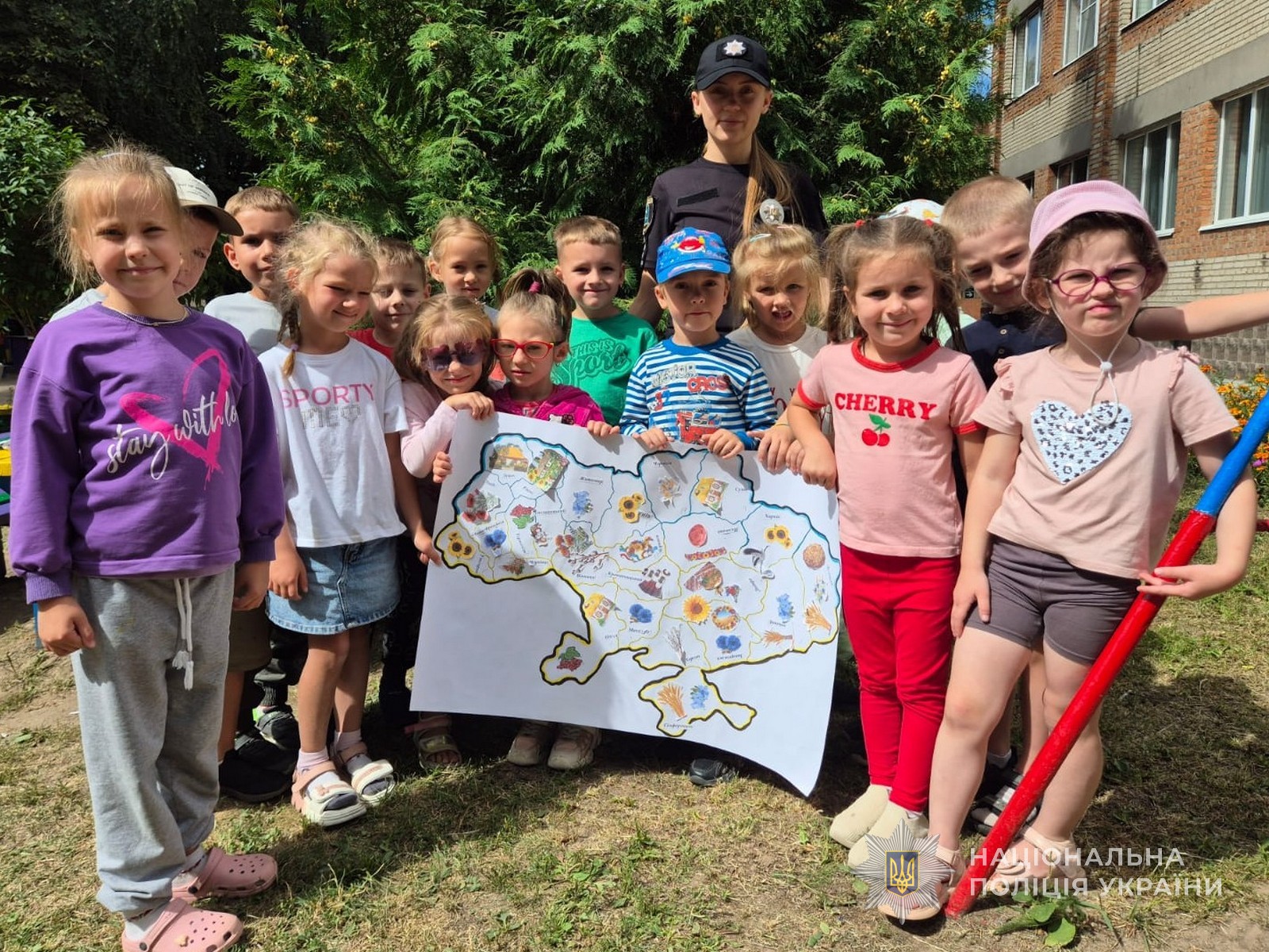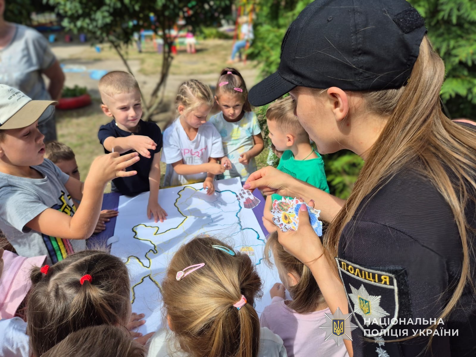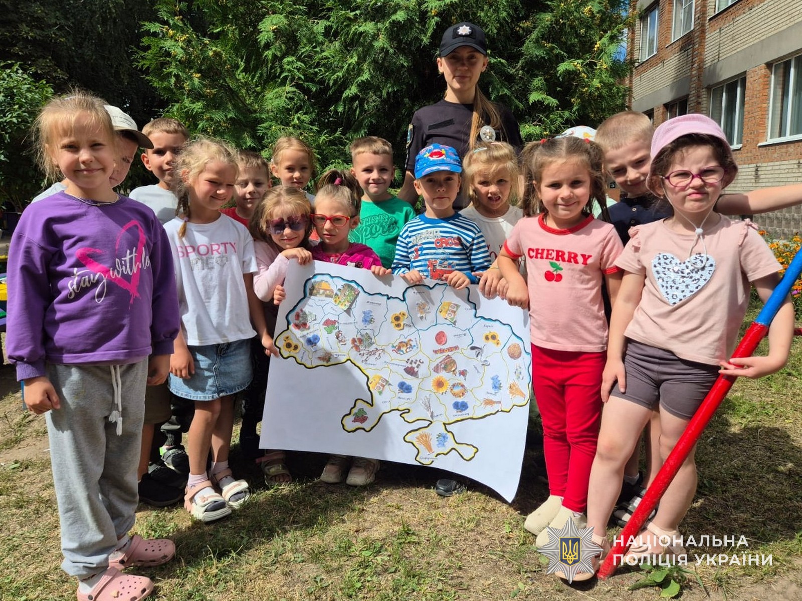 Правоохоронці розповіли дітям про історію створення незалежної України, ознайомили їх з державними символами — гербом, прапором і гімном — та пояснили їхнє значення. Також малюки дізналися, з яких областей складається наша країна та які є обласні центри.