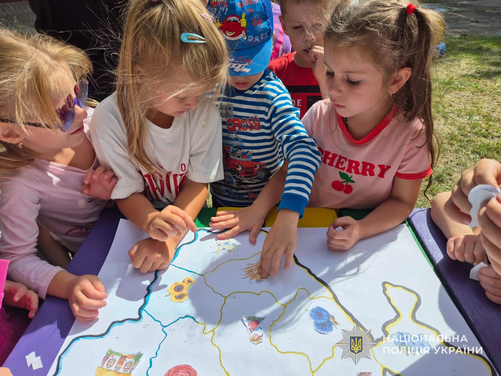 Під час інтерактивної частини заходу діти із задоволенням називали знайомі їм обласні центри, а співробітники поліції показували їхнє розташування на великій намальованій карті України. Малеча із захопленням прикріплювала наліпки з назвами міст на відповідні області.