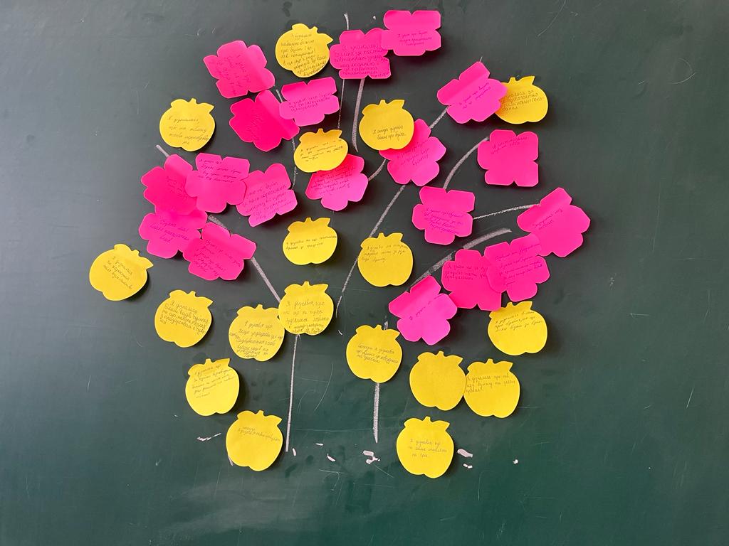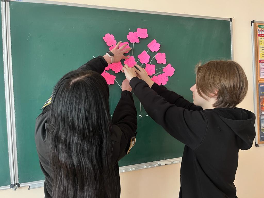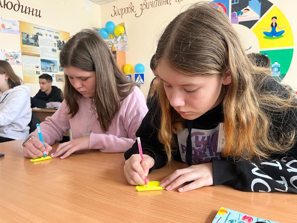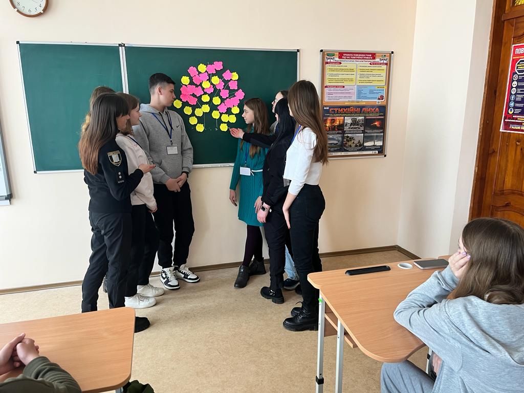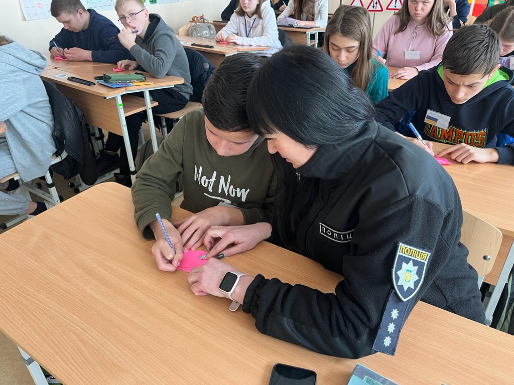 Взагалі зустріч пройшла у формі гри. Спочатку діти на листочках написали, що вони знають про булінг, та наклеїли їх на дошці, а вже в кінці заняття на інших листочках зазначили, що вони дізнались нового про це негативне явище, і вже разом з поліцейськими все обговорили.