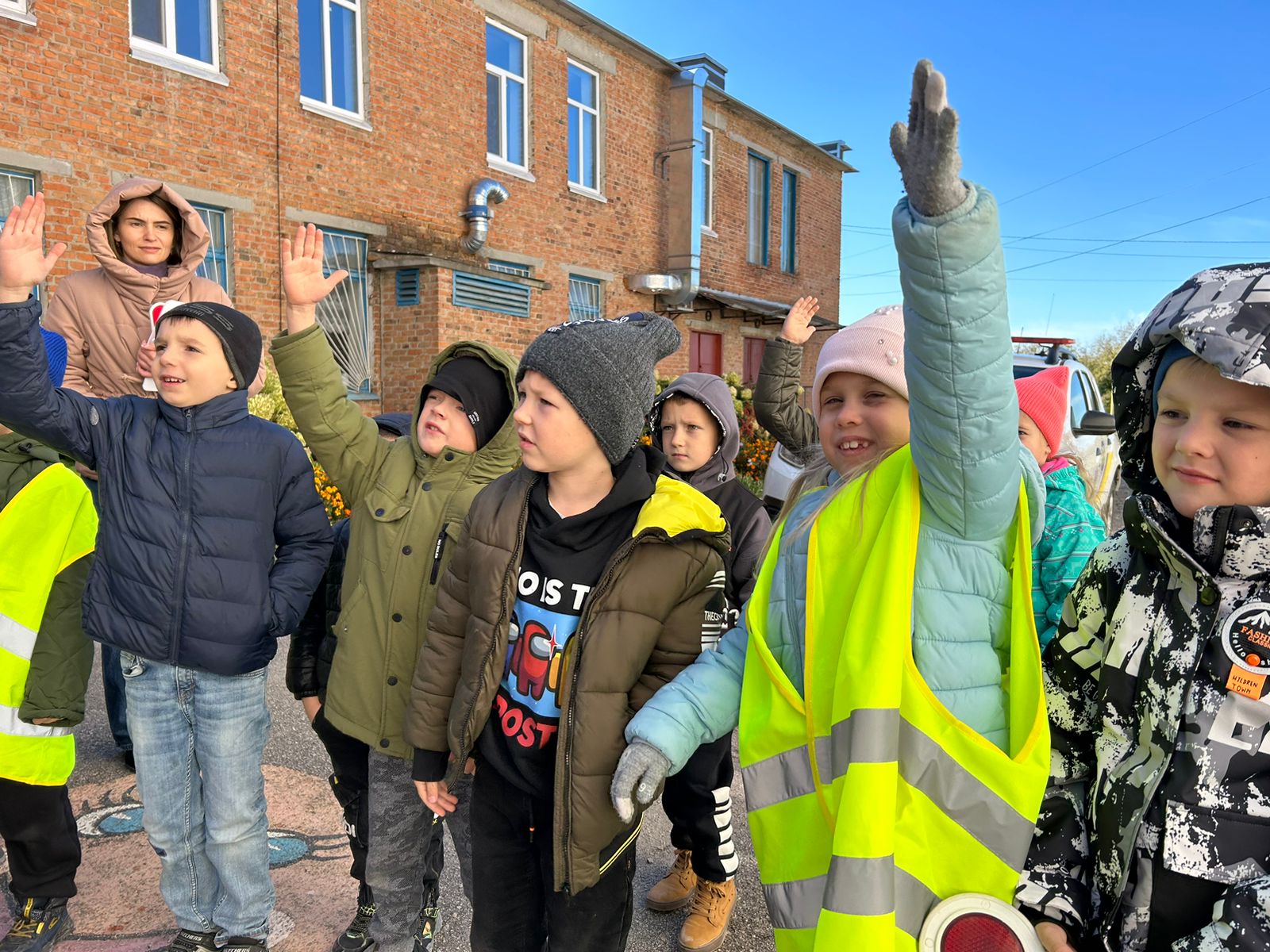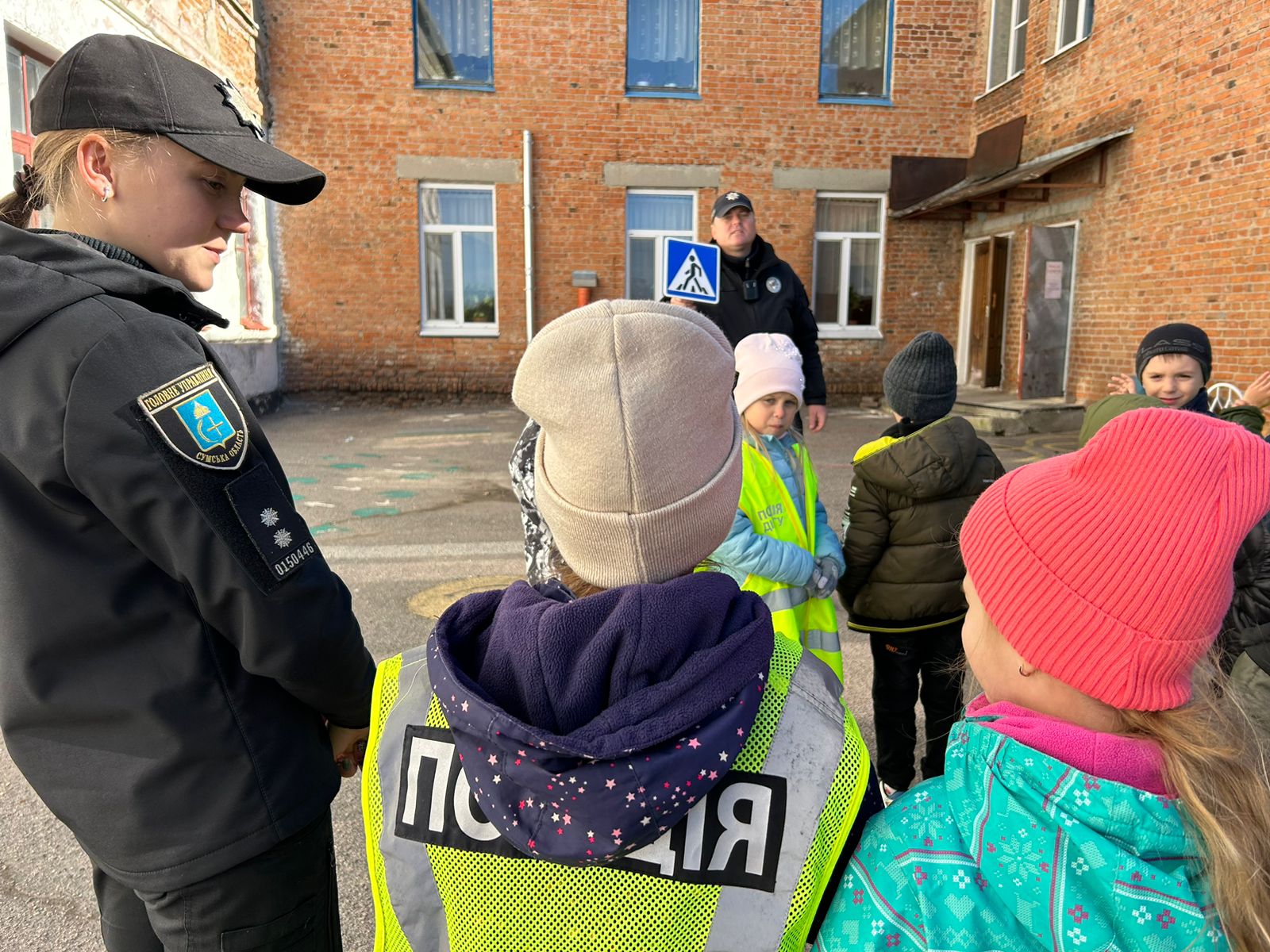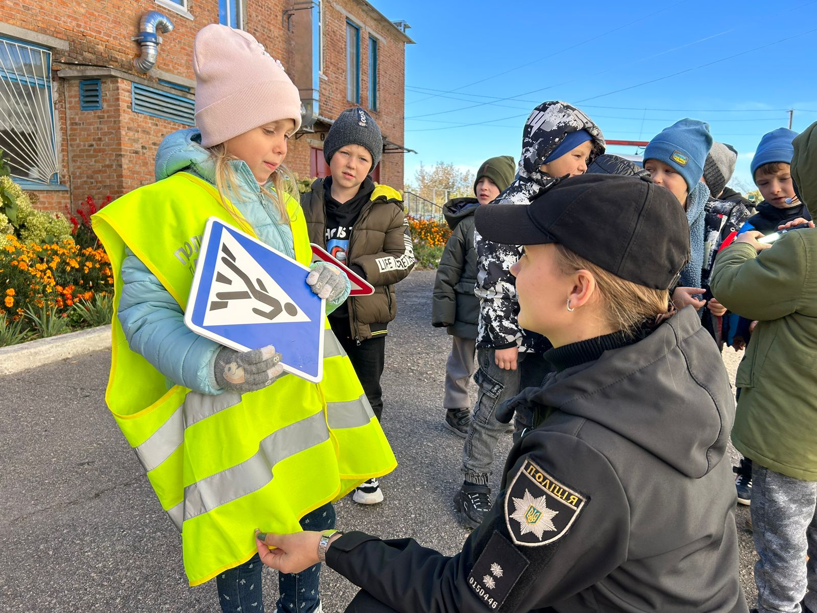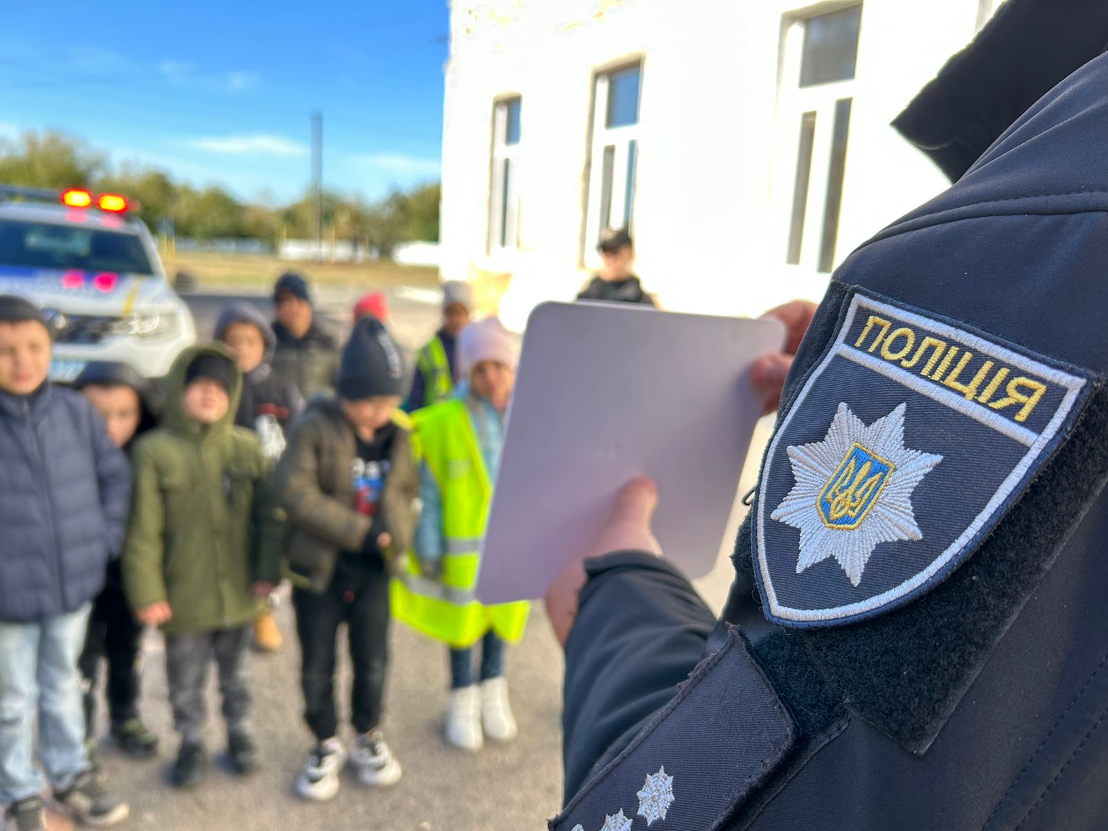 Наприкінці заходу співробітники поліції пояснили першокласникам про те, що на вулицях вже почало рано темніти, а тому всім учасникам дорожнього руху потрібно бути особливо обережними. І для того, аби водії транспортних засобів могли помітити пішохода в темряві, потрібно обов'язково виділити себе світловідбиваючими наліпками, нашивками чи іншими елементами одягу.