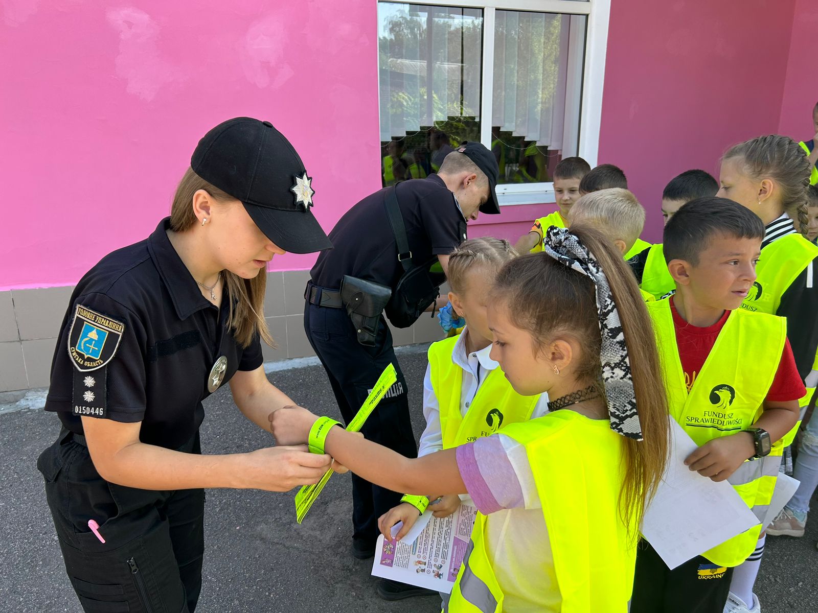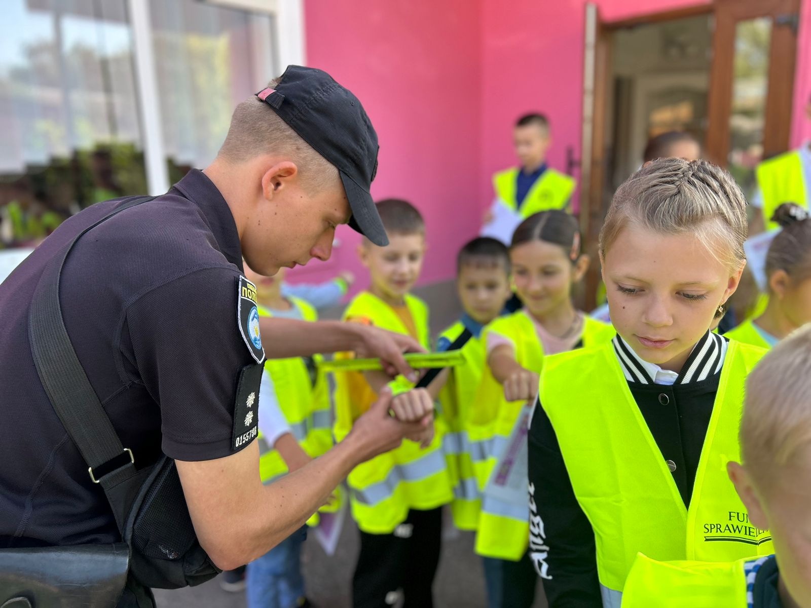 Також, співробітники поліції звернули увагу й на правила поведінки, яких потрібно дотримуватись по дорозі додому або до школи, особливо у темну пору доби. Щоб діти були помітні на дорозі у темряві, правоохоронці роздали їм спеціальні світлоповертаючі браслети.
