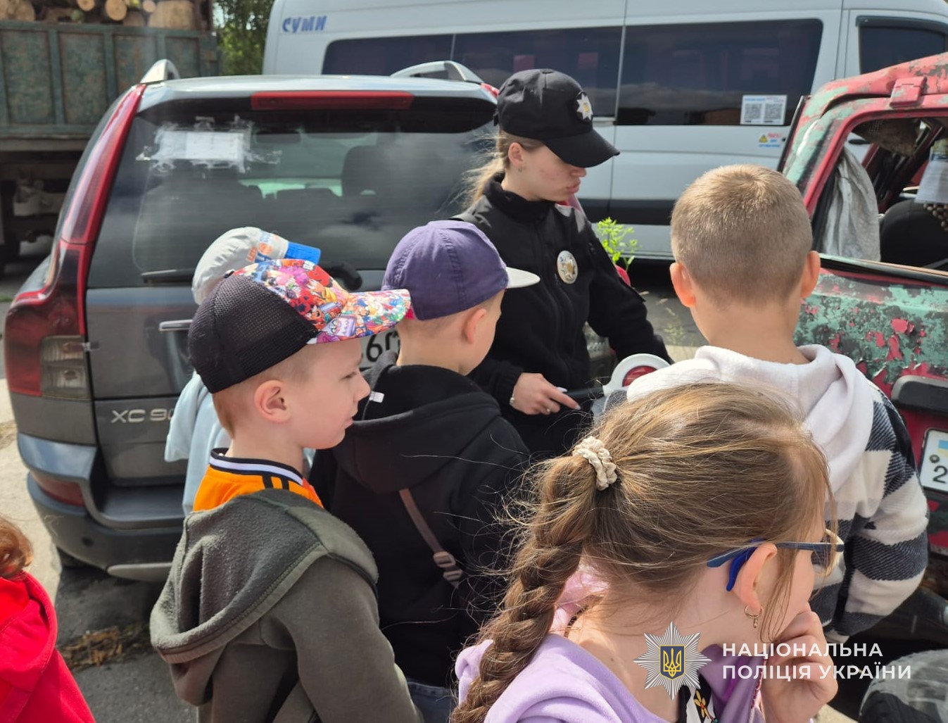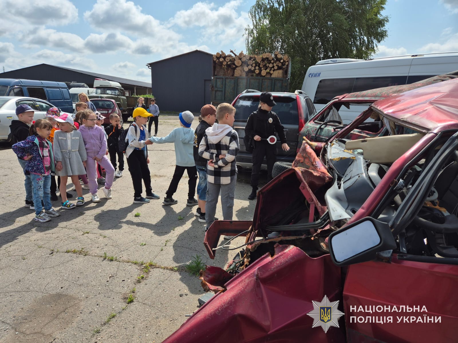 Щоб краще донести інформацію, школярам провели тематичну екскурсію на майданчик, де зберігаються автомобілі, пошкоджені внаслідок ДТП. Такі реальні приклади справили сильне враження на дітей і стали ефективним візуальним доповненням до розповіді про небезпеку порушення ПДР.