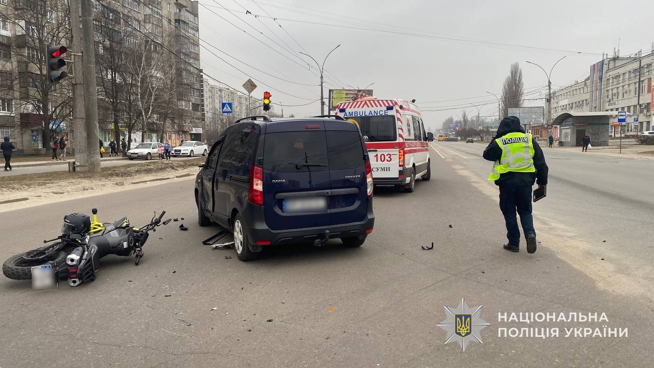 Подія сталась вчора, близько 15:00 години, на проспекті Перемоги у обласному центрі. Як попередньо встановили правоохоронці, 46-річний водій, керуючи автомобілем «Dacia Dokker», допустив зіткнення з мотоциклом під керуванням 30-річного сумчанина.