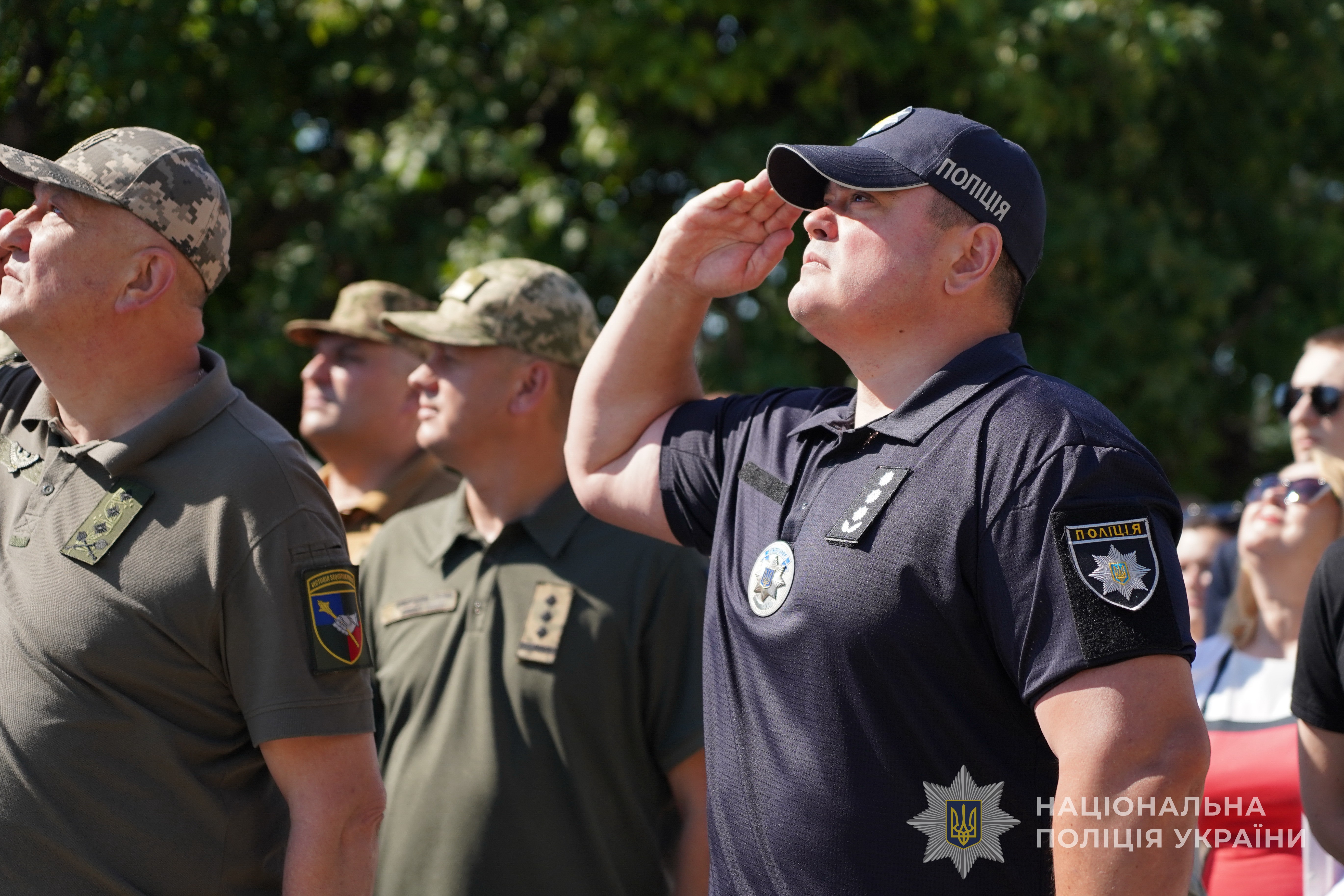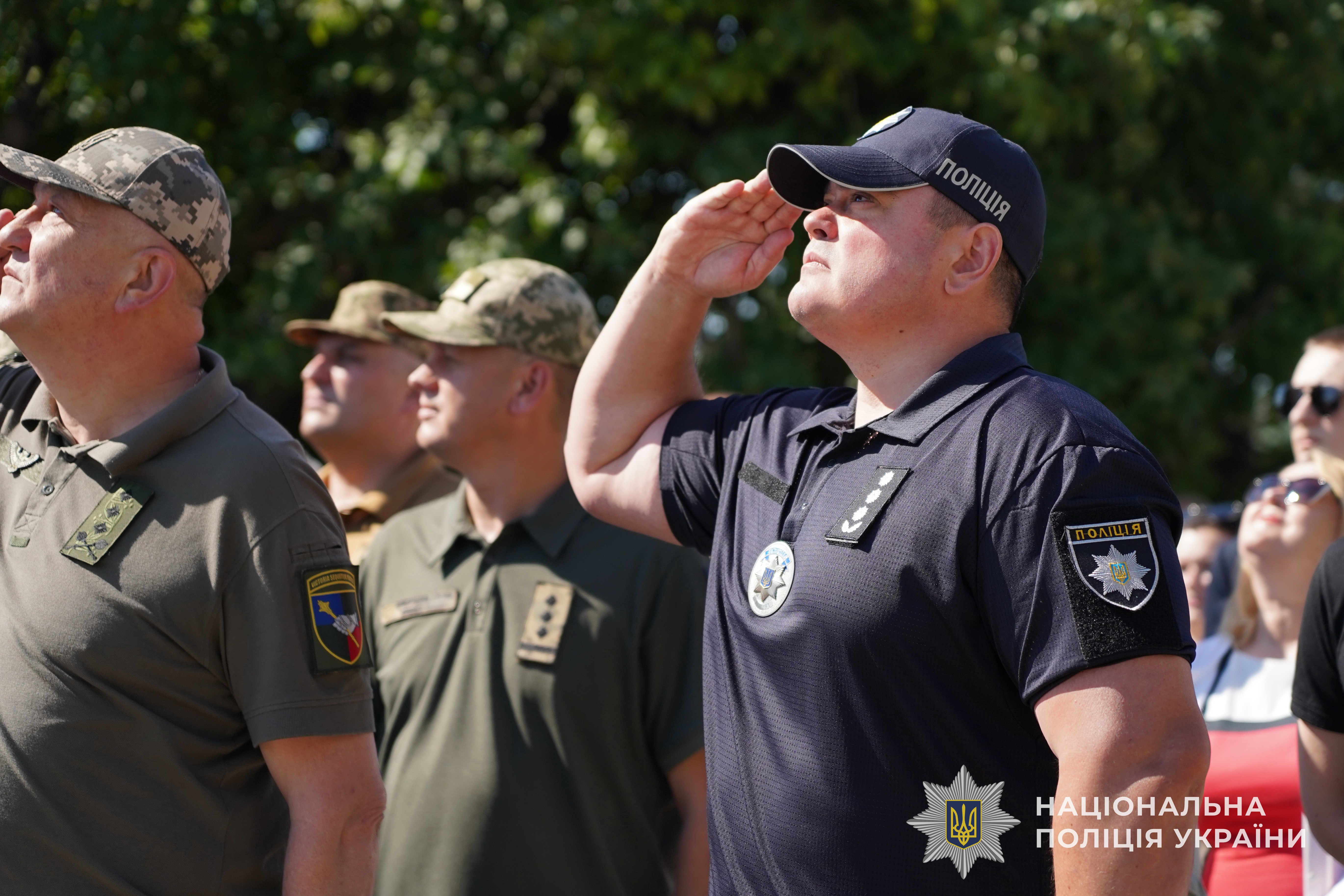 Після чого, біля головного прапору в місті Суми, присутні вшанували державні символи України, які є свідченнями високого духу народу України, його історичних прагнень, суверенності та автентичності.