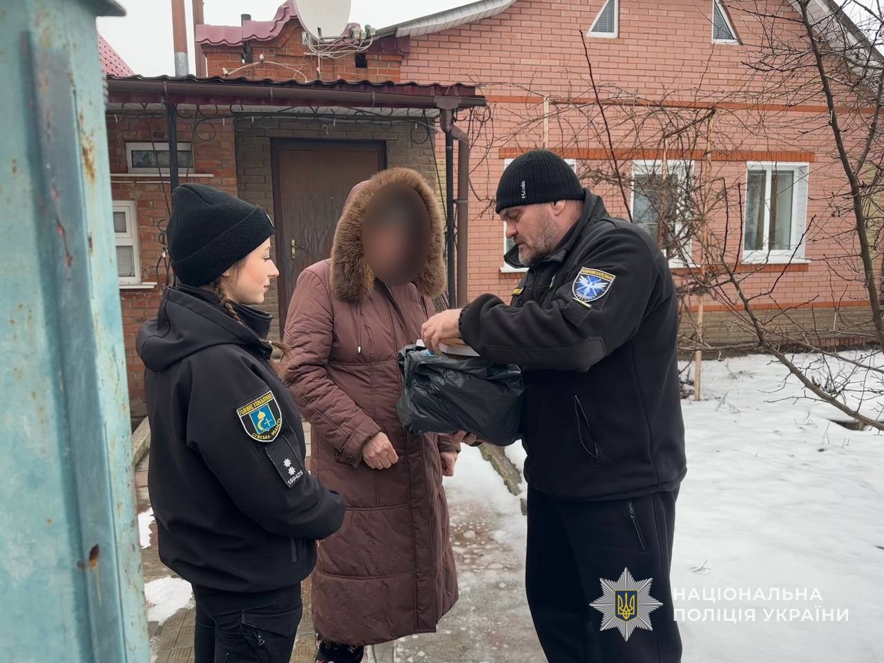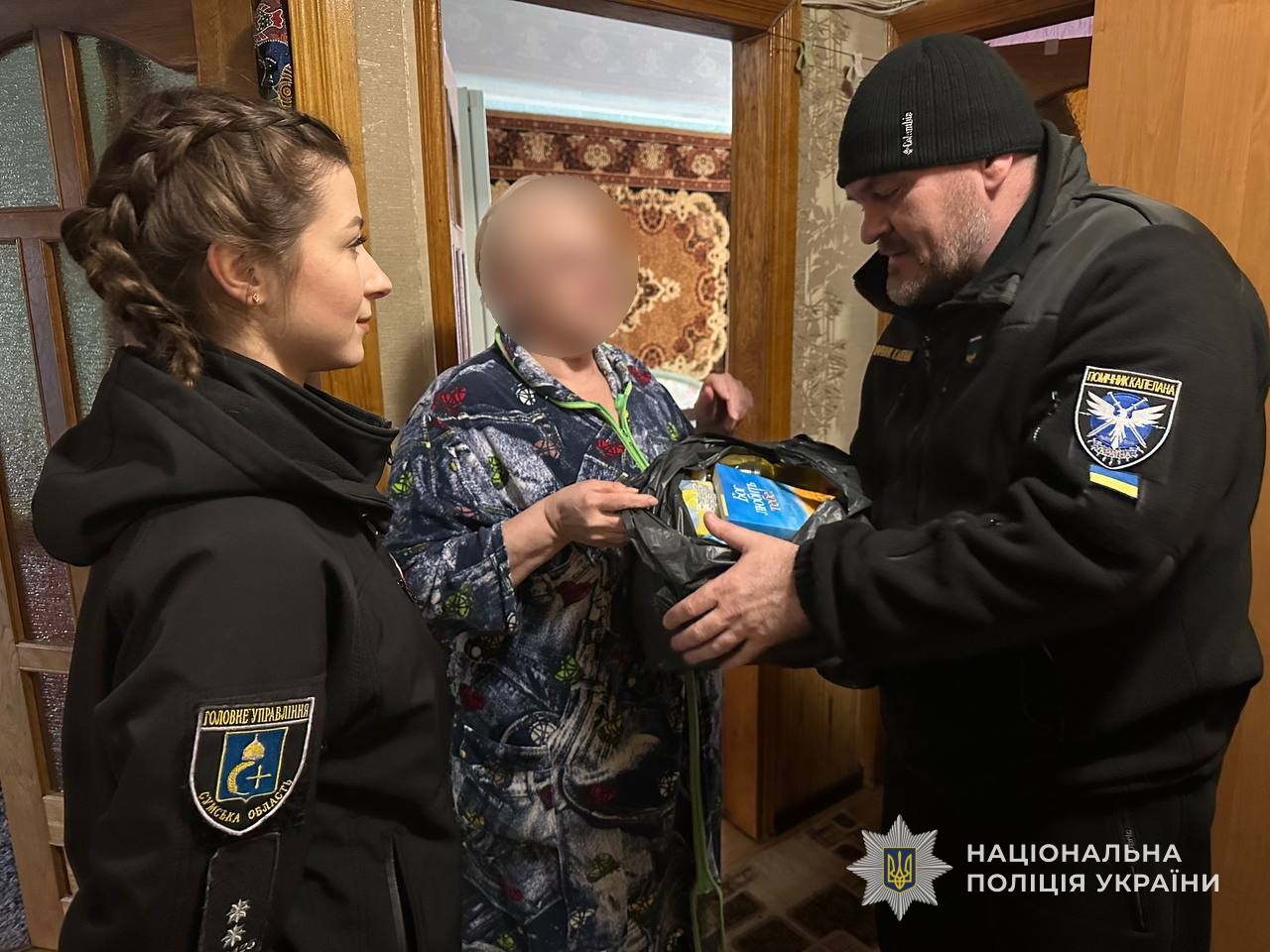 Окрім цього, працівники поліції з метою підтримки надали сім’ям волонтерську допомогу від Церква Різдва м. Суми, в якій були пакунки з продуктами харчування.
