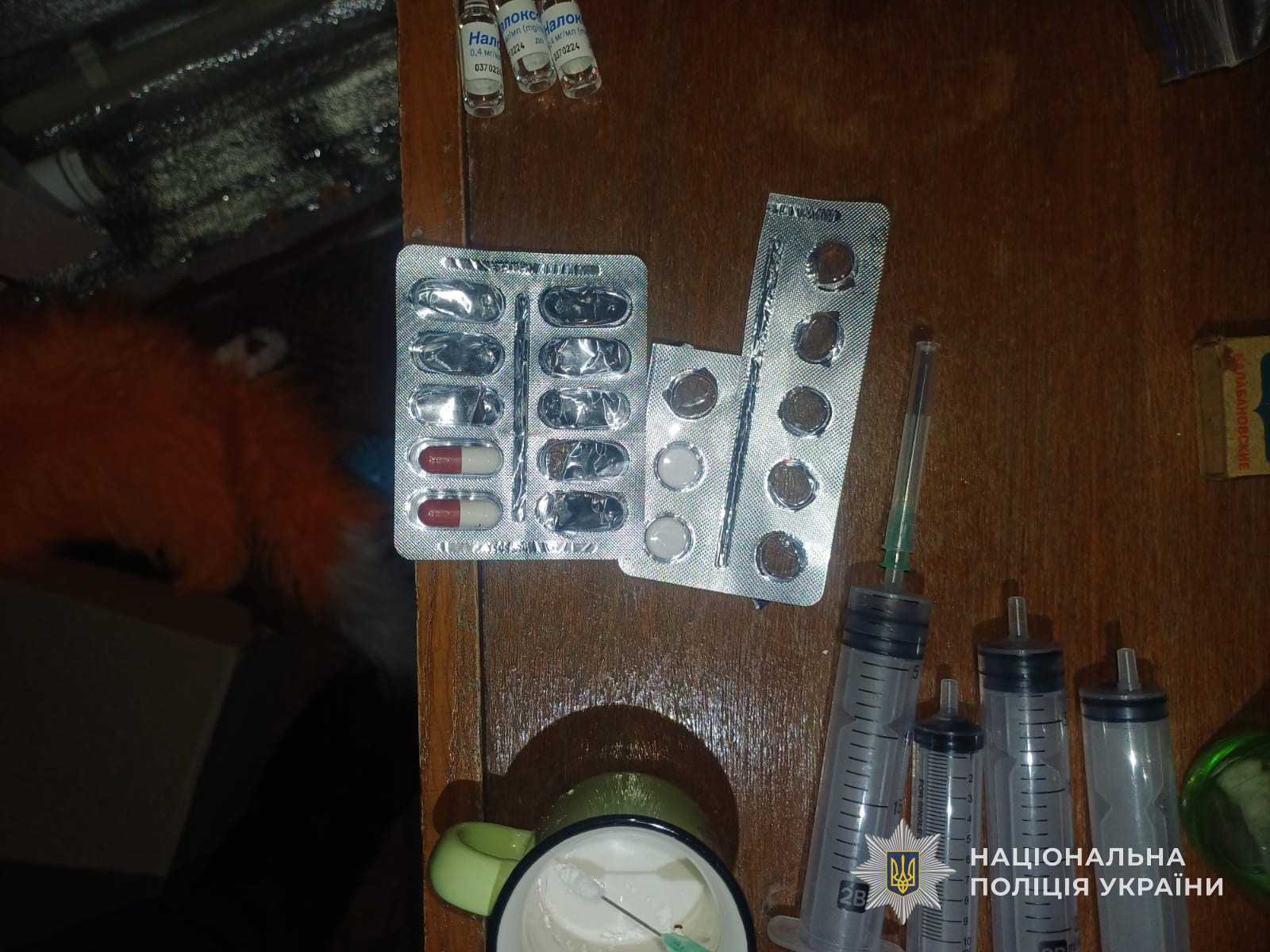 Під час санкціонованого обшуку у квартирі правоохоронці виявили та вилучили пігулки з наркотичними засобами, згортки з канабісом, шприци із залишками рідини, порожні ампули лікарських препаратів та інші предмети з характерними нашаруваннями. Усе вилучене направлено на експертне дослідження.
