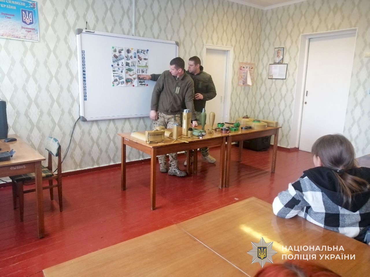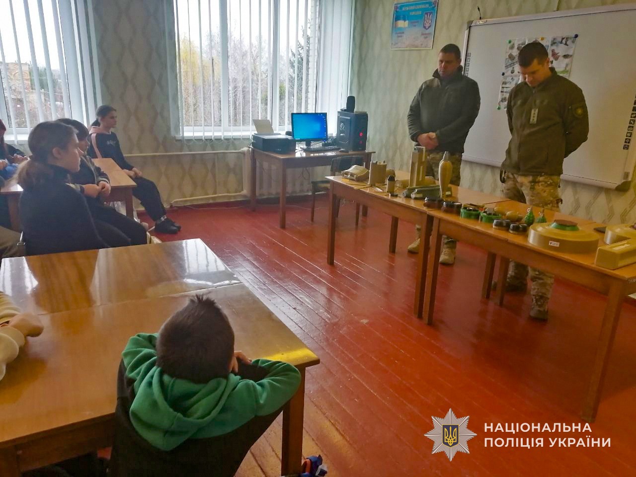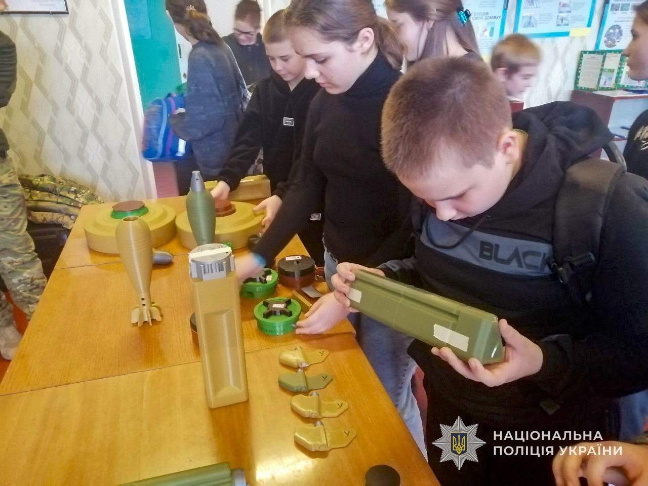 Поліцейські продемонстрували школярам муляжі мін, боєприпасів та інших небезпечних предметів, з якими цивільні можуть зіткнутися у прифронтових регіонах. Дітям пояснили, як виглядають найбільш поширені вибухонебезпечні предмети, де вони можуть бути приховані та чому в жодному разі не можна їх чіпати чи наближатися.