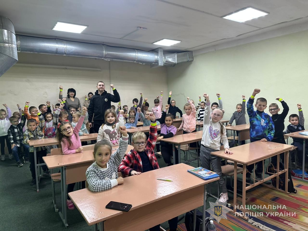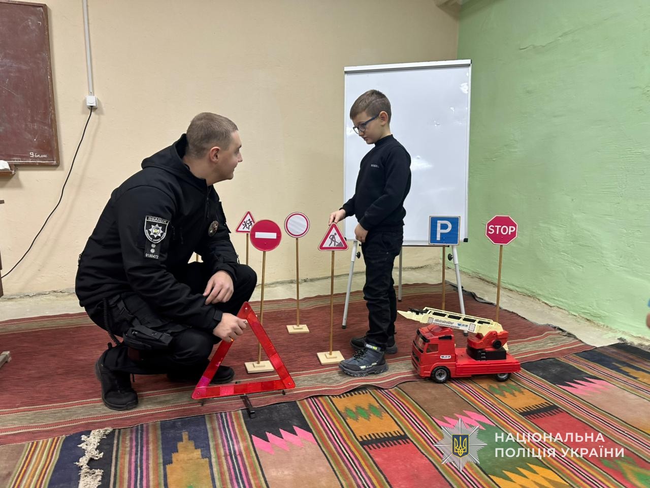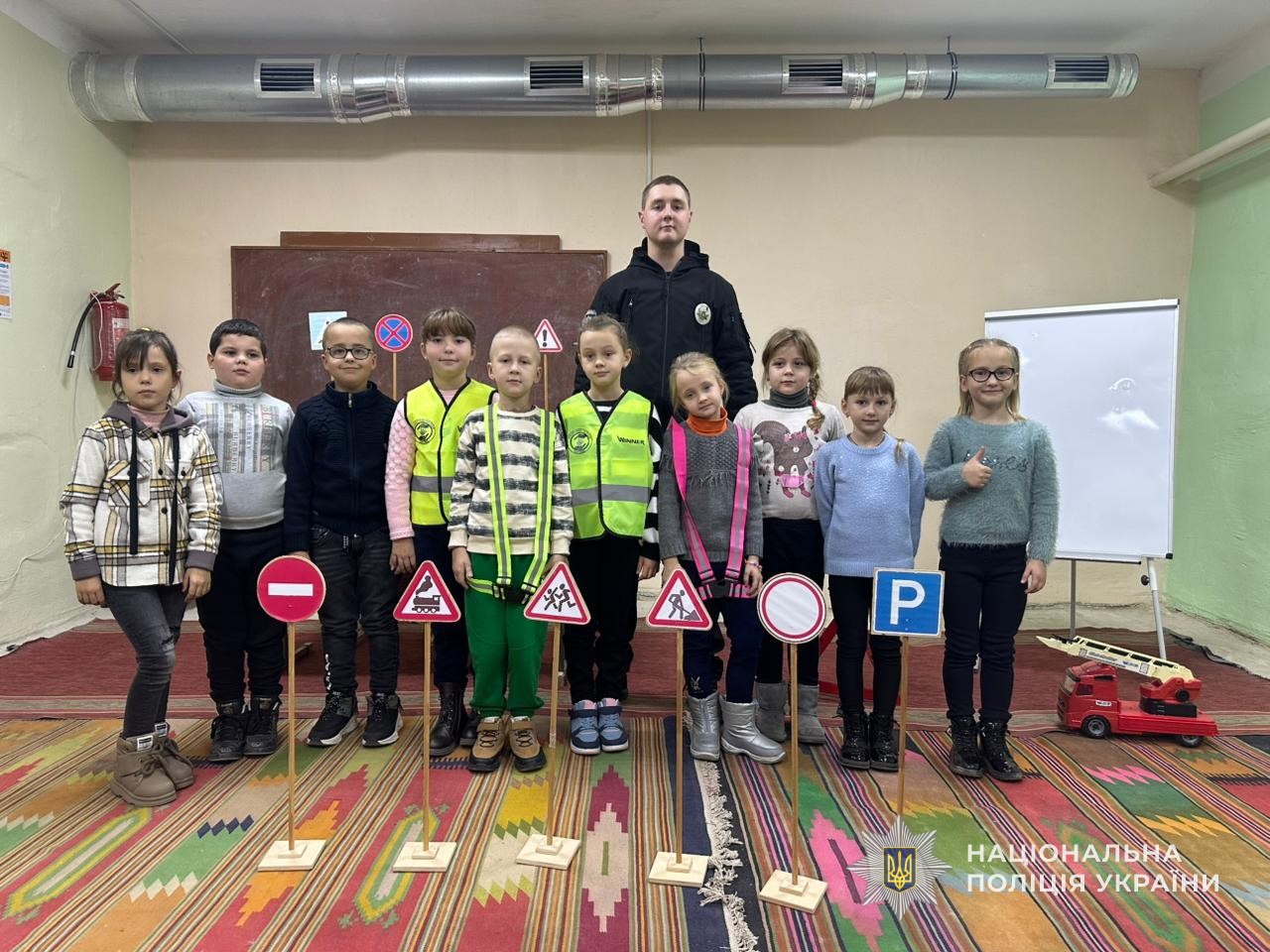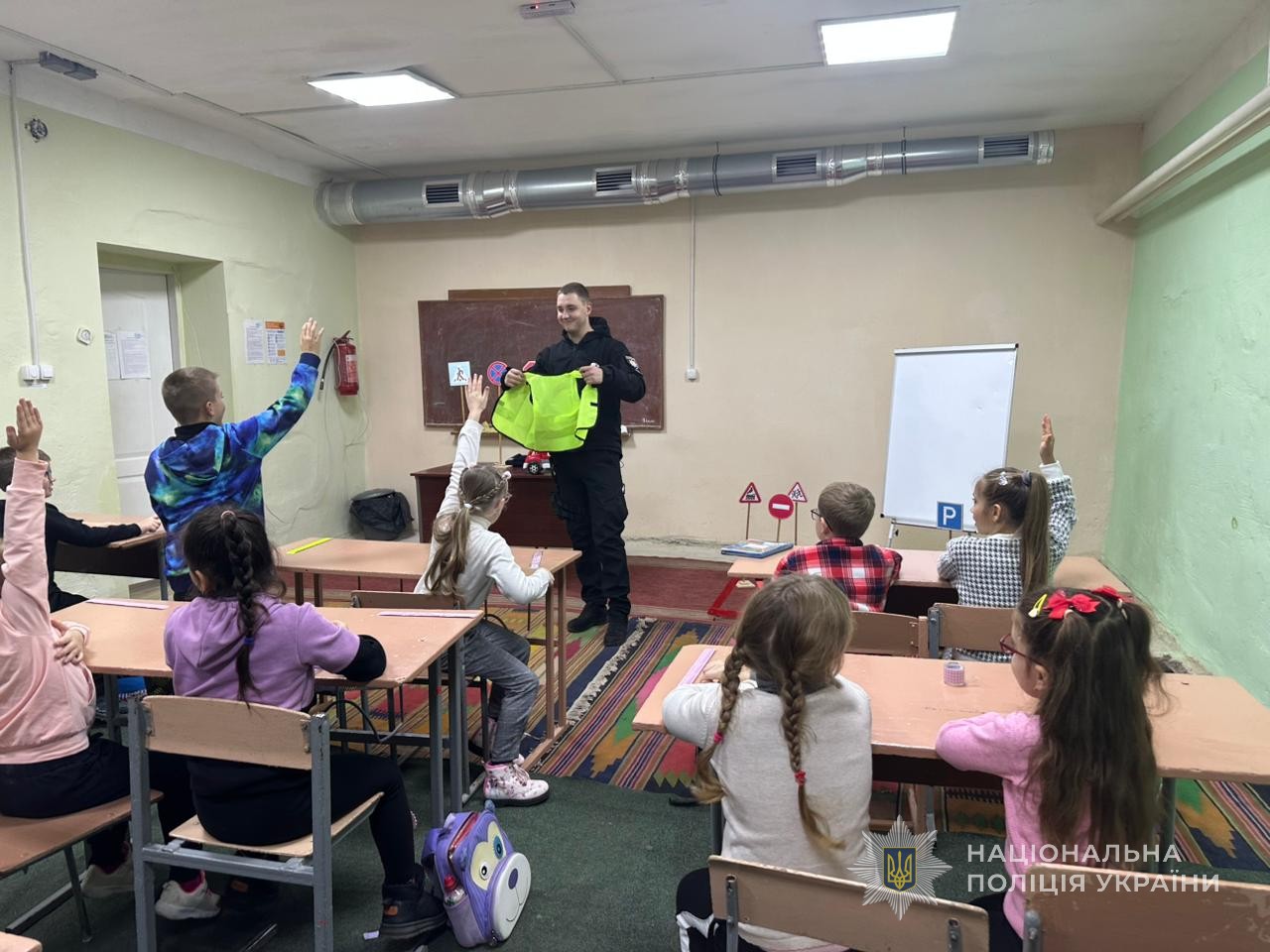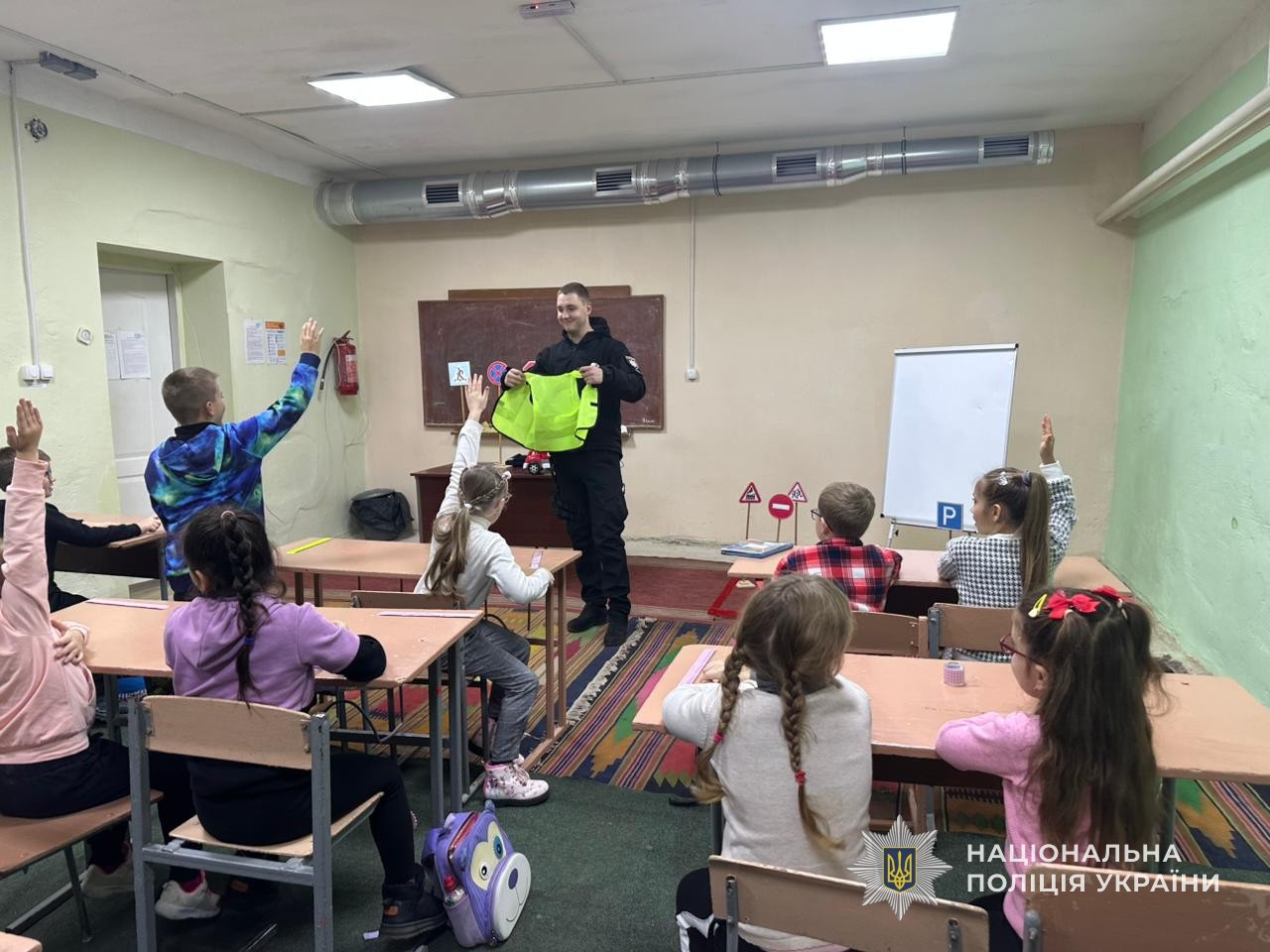 Під час заняття поліцейські запропонували дітям цікаву гру на закріплення важливих знань, а також роздали спеціальні світлоповертальні елементи, які допоможуть бути більш помітними на дорогах.