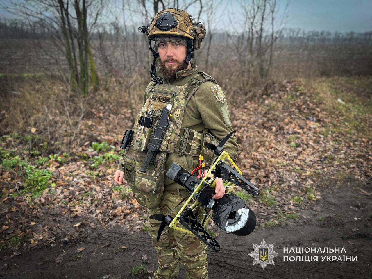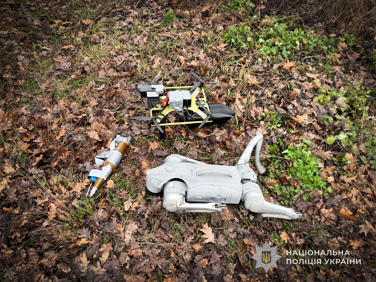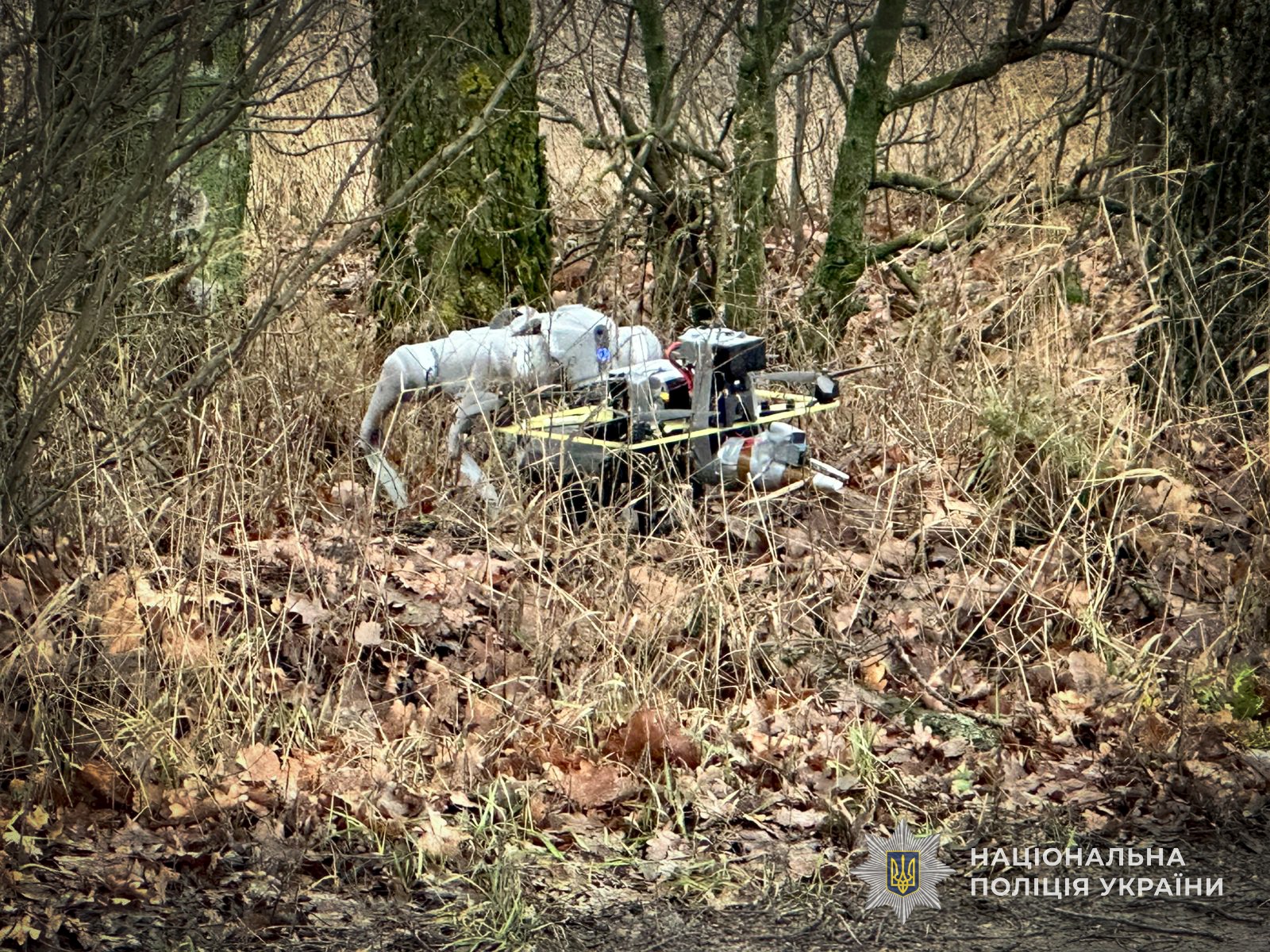 Ворожий безпілотник квадрокоптерного типу, що ніс на собі заряд вибухівки, було виявлено в лісосмузі поряд з дорогою. Аби не постраждати самим та з безпечної відстані дослідити знахідку, співробітники управління вибухотехнічної служби ГУНП в Сумській області скористалися допомогою робота-собаки.