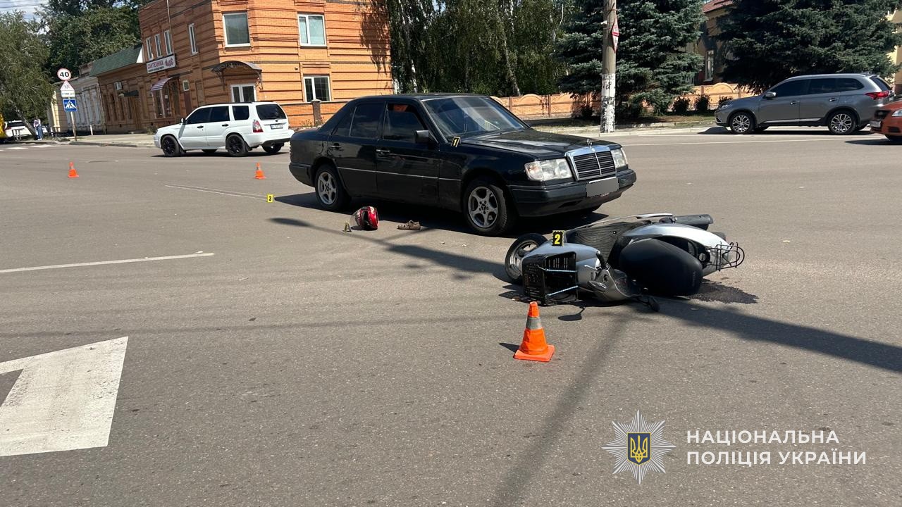 Учора в місті Охтирка сталася дорожньо-транспортна пригода за участю скутера Honda та легкового автомобіля Mercedes-Benz. На місці аварії працювала слідчо-оперативна група поліції.