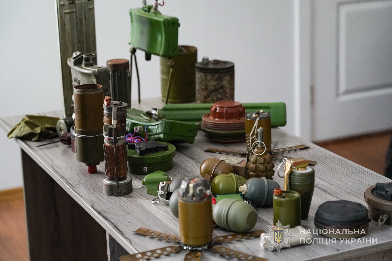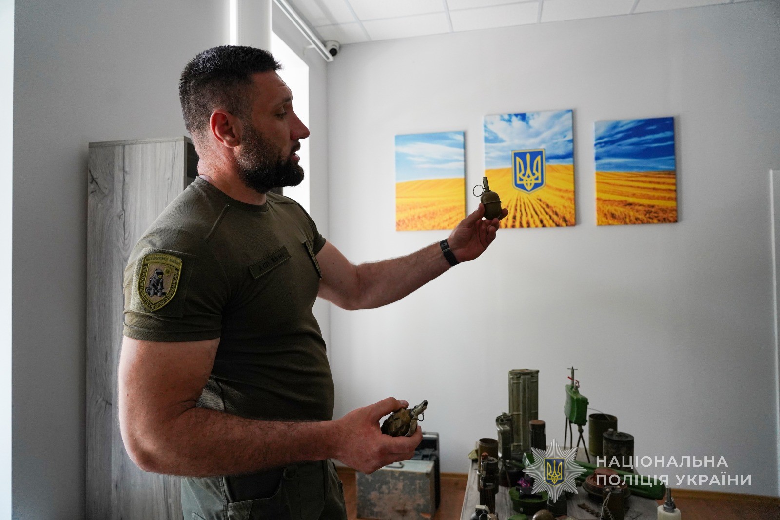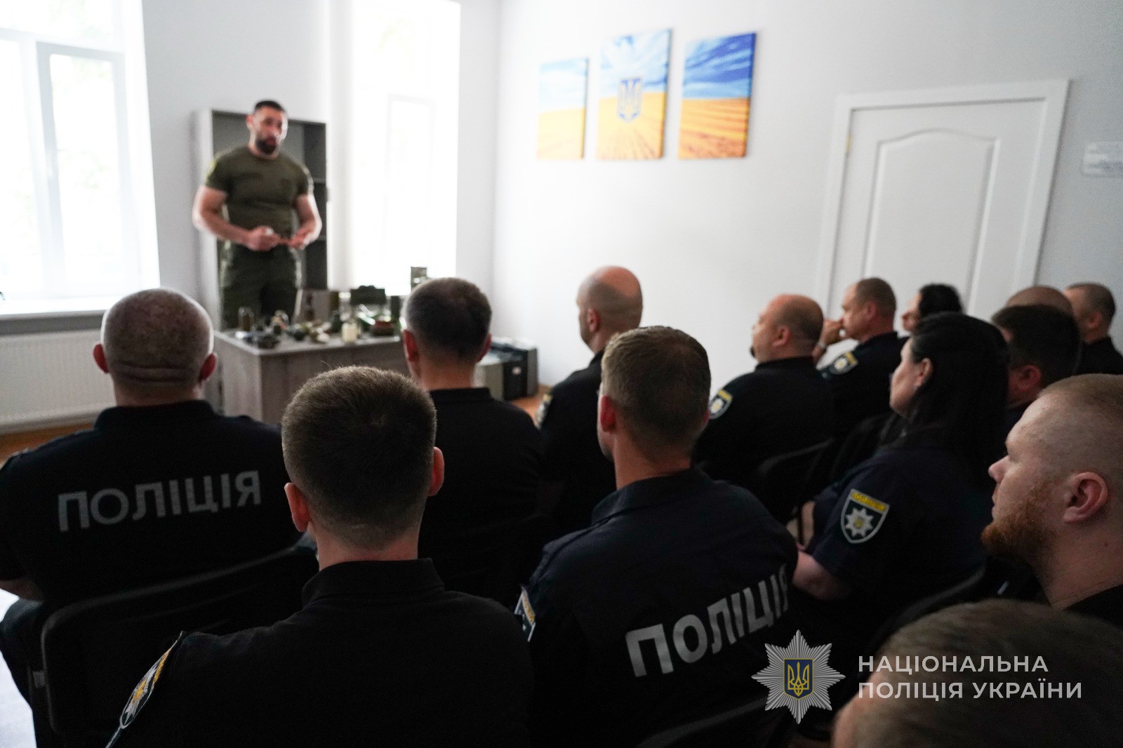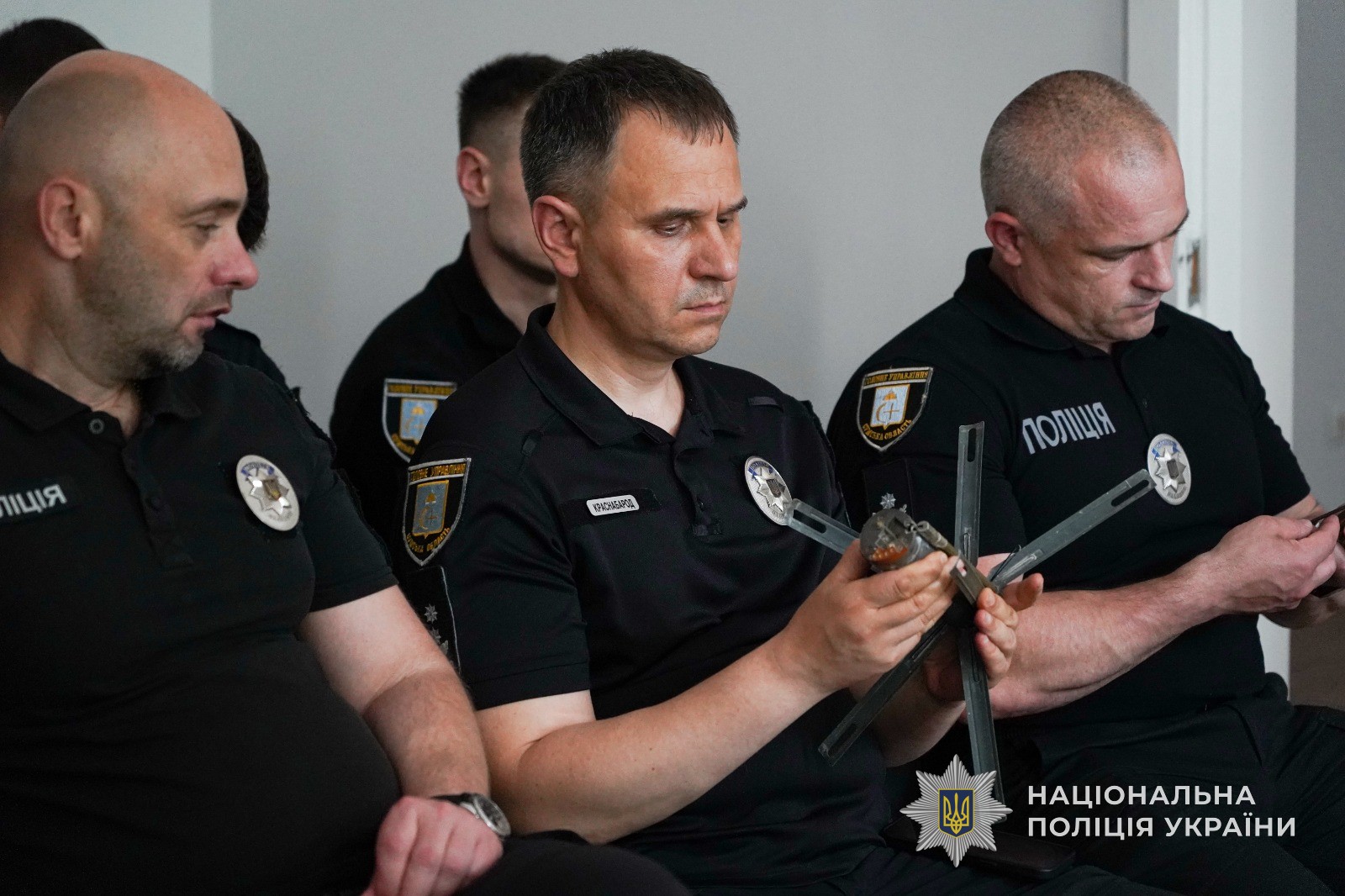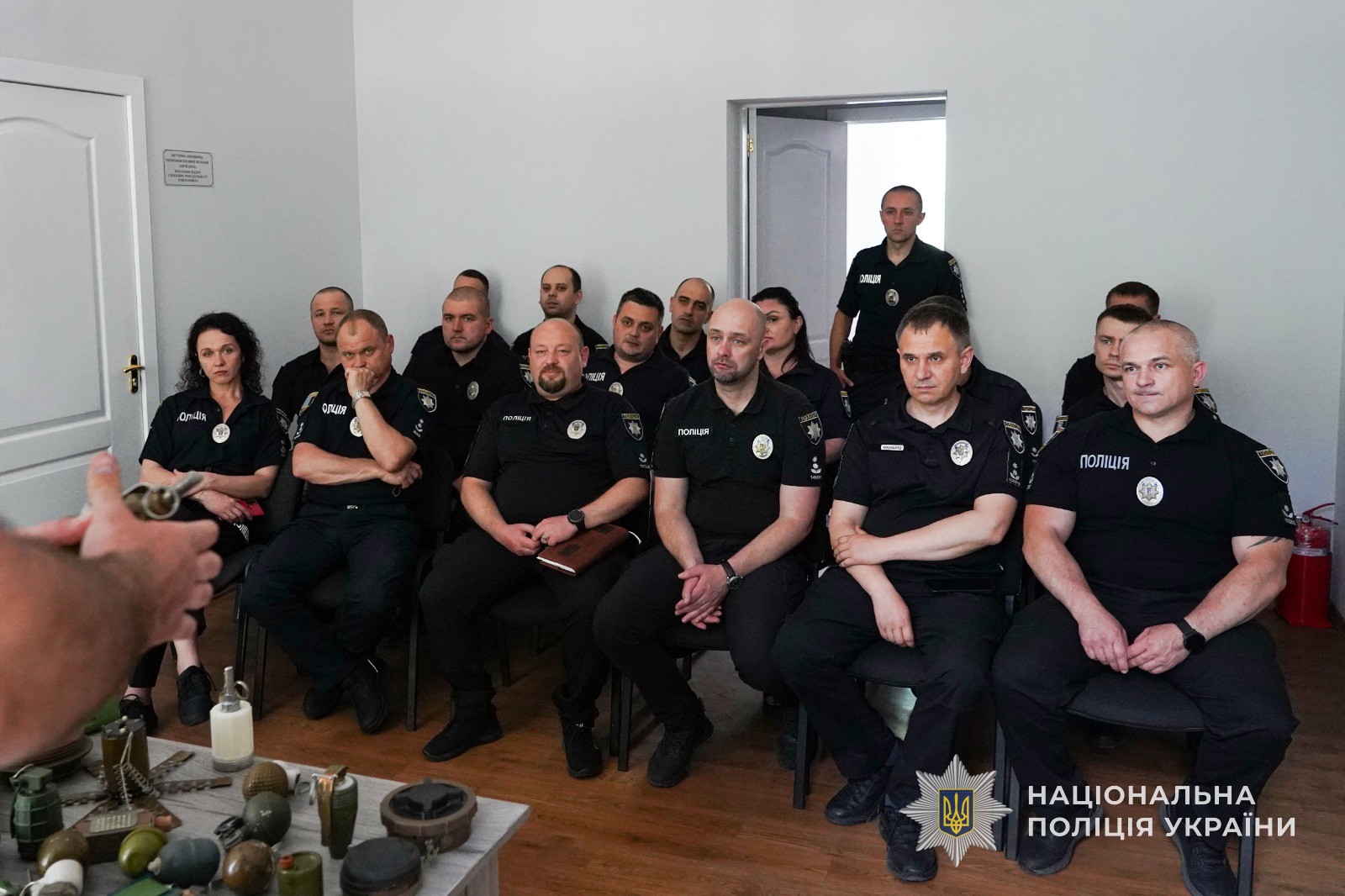 Потім вибухотехнік продемонстрував міні-експозицію у вигляді муляжів гранат, кількох різновидів мін та іншого військового спорядження – про кожен із цих експонатів він детально розповів колегам. Зокрема поліцейський повідомив, що такі небезпечні предмети, що візуально нагадають метеликів, вибухотехніки знаходять навіть у дитячих іграшках.