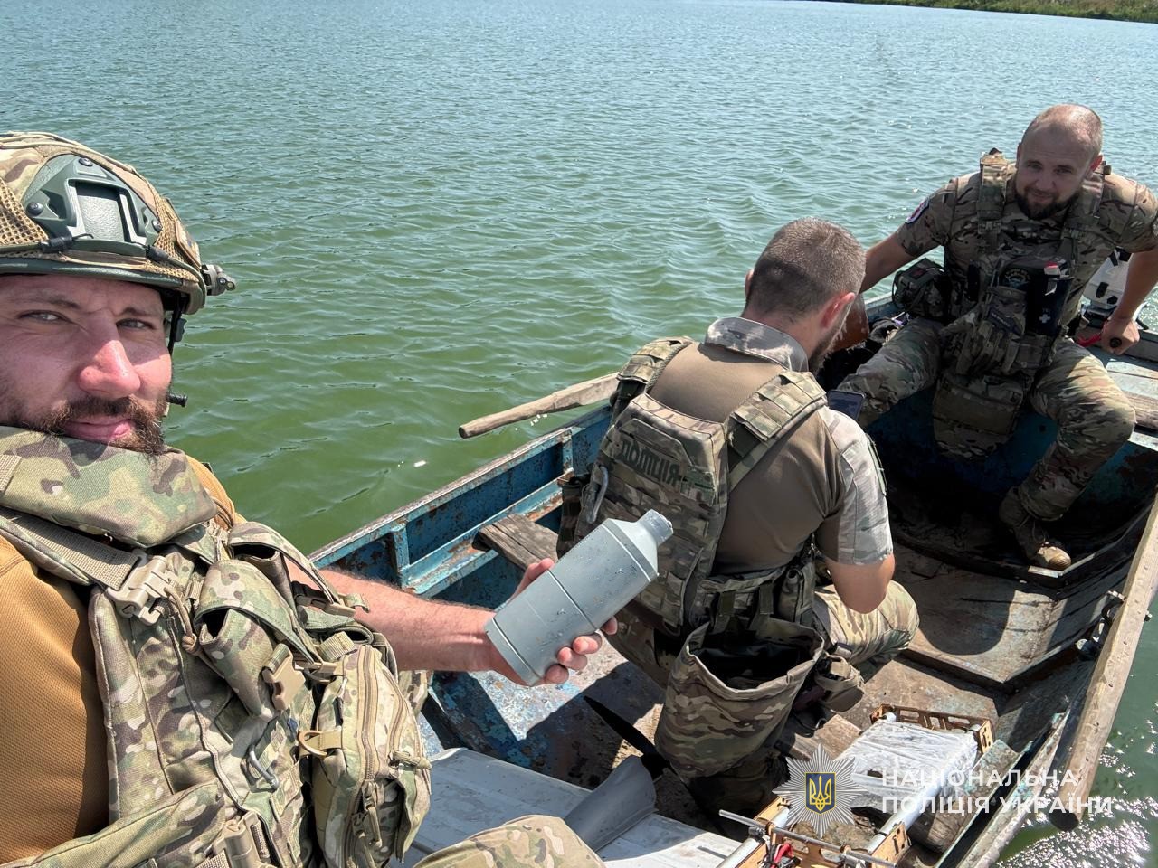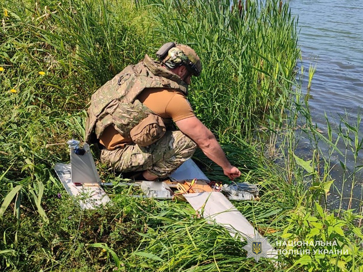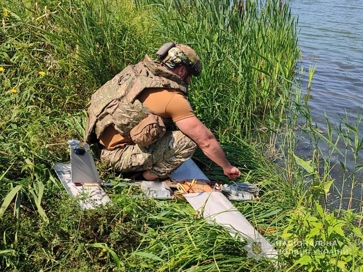 Аби знешкодити ворожий ударний дрон, що впав на території району, поліцейським вибухотехнікам довелося подолати довгий шлях, і навіть форсувати на човні водну перешкоду.