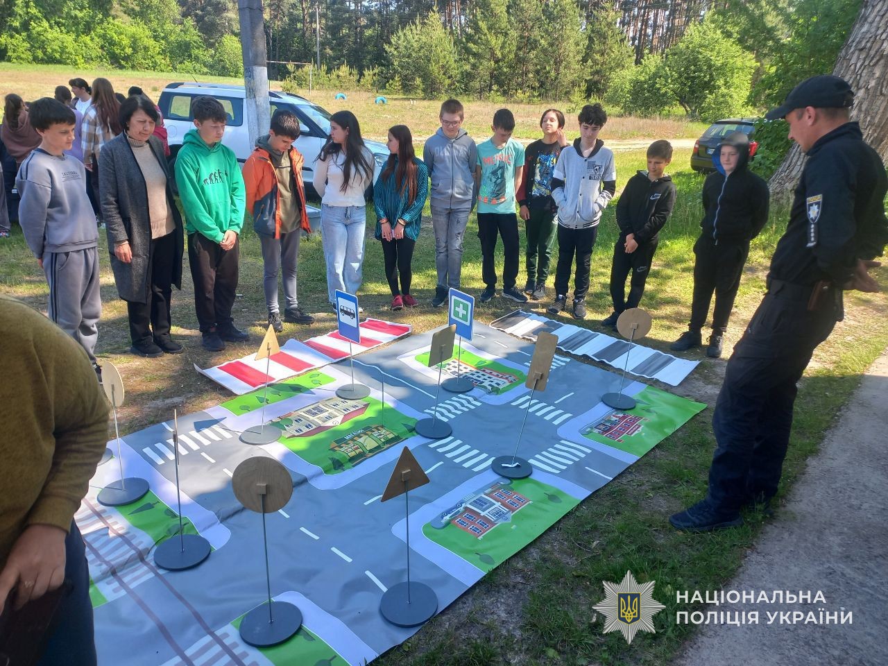 На просторовому макеті умовного «містечка» поліцейські нагадали учням правила дорожнього руху та пояснили значення відповідних дорожніх знаків. Разом із дітьми вони розглянули порядок безпечних дій у різних дорожніх ситуаціях. Також правоохоронці наголосили на обов’язковому використанні світловідбивальних елементів у темну пору доби та подарували дітям наліпки, які можна прикріпити до портфелів, щоб бути помітнішими в темряві.