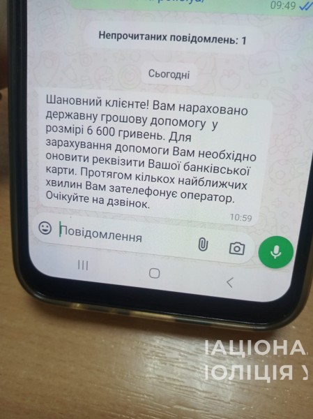 У Тростянці, 50-річній жінці на мобільний телефон зателефонував невідомий, який представився працівником банку та повідомив, що їй надійшла грошова допомога від держави. Для її зарахування на картку він попросив жінку назвати йому чотиризначний код, що надійшов їй в СМС-повідомленні. Після того, як введена в оману мешканка Тростянця надала зловмиснику необхідні дані, той заволодів її грошима з картки у сумі 27 000 гривень.