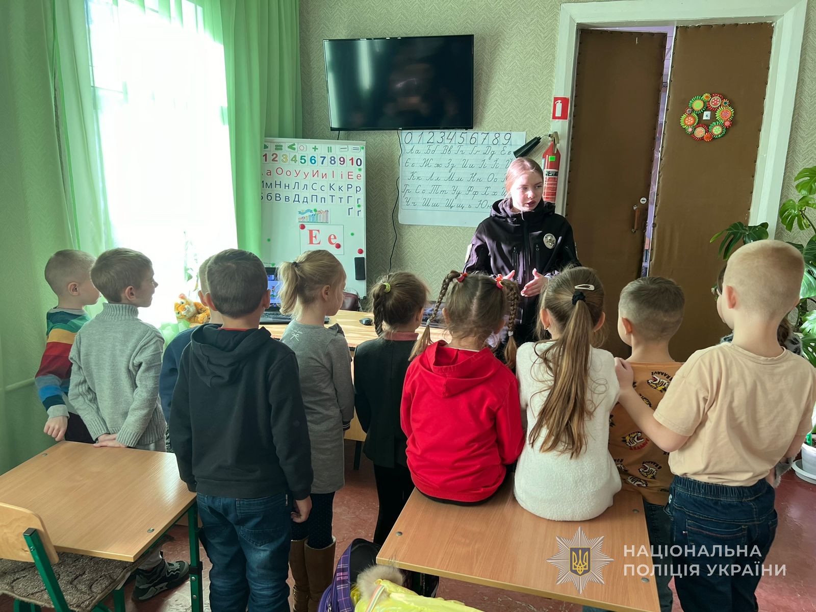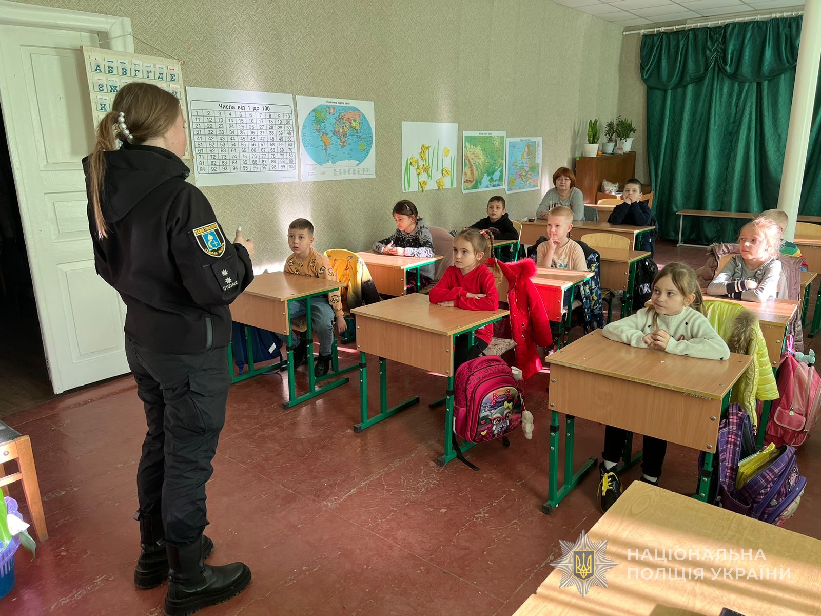 Учням нагадали як слід переходити проїжджу частину дороги. Інспекторка наголосила на тому, що не можна перебігати дорогу перед транспортом, який наближається. А також, у вечірній час та у темну пору доби, слід носити світловідбивні елементи, щоб бути помітним для водіїв.