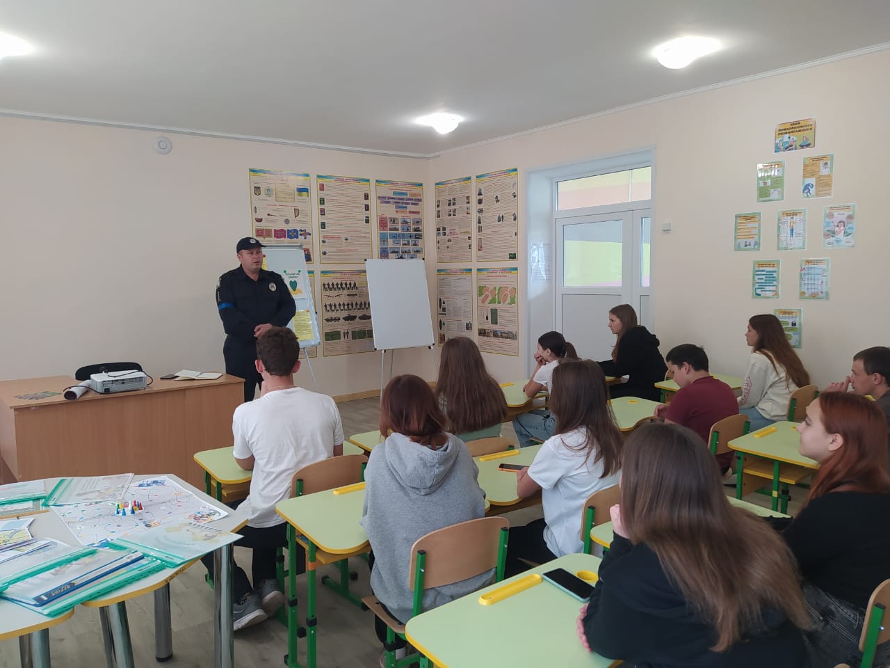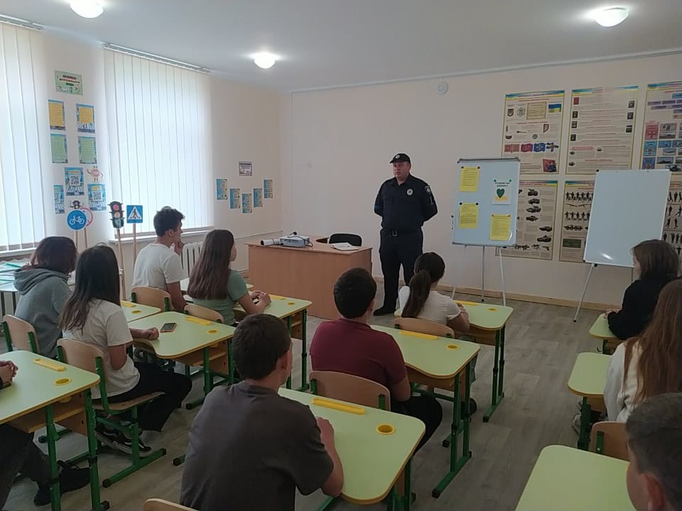 У навчальному закладі поліцейські провели декілька виховних уроків з учнями восьмих класів. Основними темами яких стали: мінна безпека, профілактика адміністративних правопорушень та правила безпечного відпочинку біля водойм.